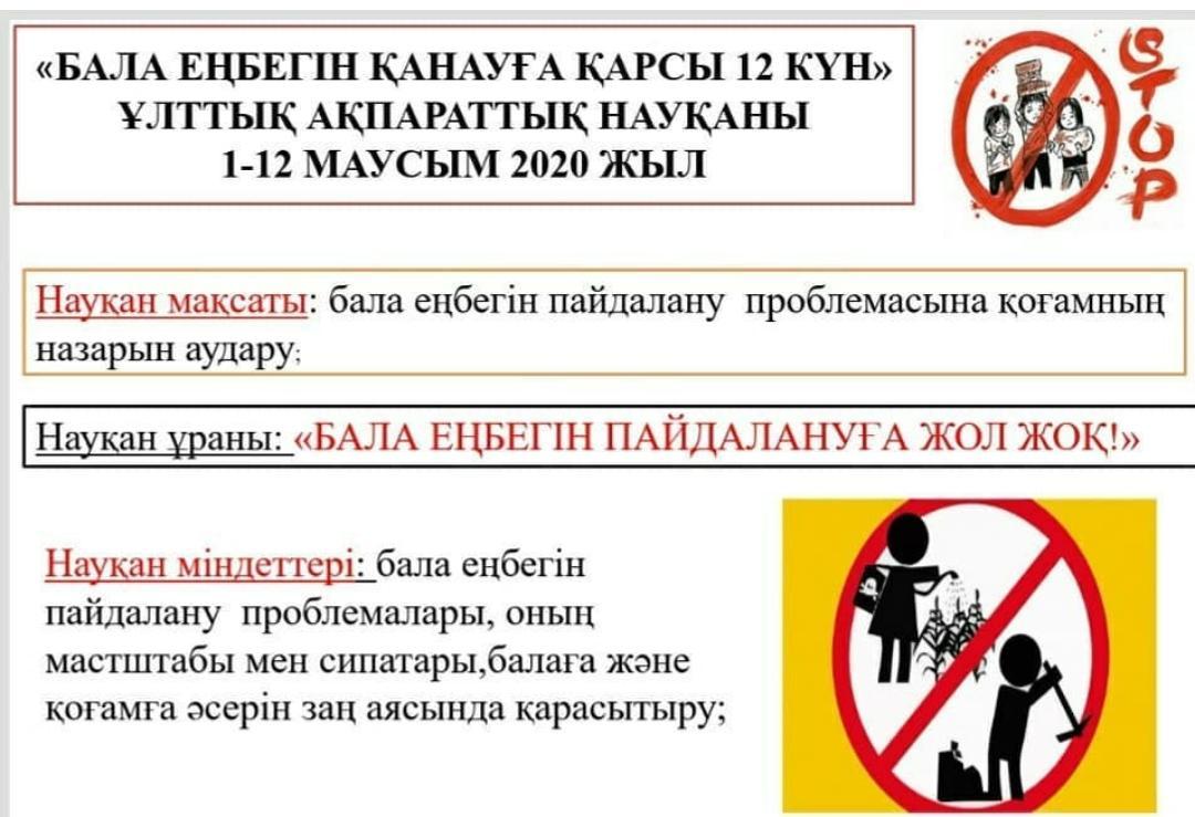 02 июнь 2020 0 1 2 3 4 5 «Бала еңбегін қанауға қарсы 12 күн» науқаны «Бала еңбегін қанауға қарсы 12 күн» науқаны