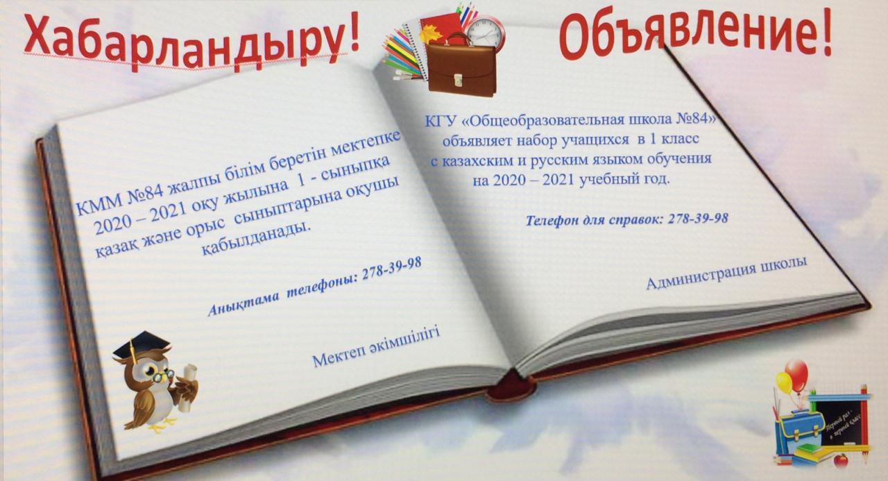 22 июль 2020 0 1 2 3 4 5 Хабарландыру! КММ №84 ЖББ мектепке 2020-2021 оқу жылына 1 - сыныпқа қазақ және орыс сыныптарына оқушы қабылданады.