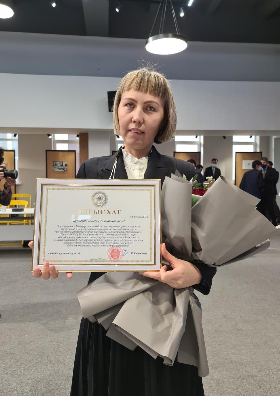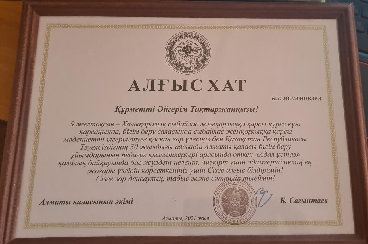 9 желтоқсан Халықаралық сыбайлас жемқорлыққа қарсы күрес күні қарсаңында білім беру саласында сыбайлас жемқорлыққа қарсы мәдениетті ілгерілетуге қосқан зор үлесі мен ҚР Тәуелсіздігінің 30 жылдығы аясында Алматы қаласы білім беру ұйымдарының педагог қызметкерлері арасында өткен "Адал ұстаз" қалалық байқауында бас жүлдені иеленгені үшін мектебіміздің қазақ тілі мен әдебиеті пәні мұғалімі Исламова Әйгерім Тоқтаржанқызы қала әкімі Б. Сағынтаевтың арнайы алғыс хатымен марапатталып, оны салтанатты түрде әкім орынбасары Е. Бабақұмаров табыс етті. Шығармашылығы мен кәсіби қызметі жолында адалдығын танытып келе жатқан Әйгерім Тоқтаржанқызына биік белестерден көріне беруін тілейміз. Жауапты: ДОІЖО Джакупова А.А