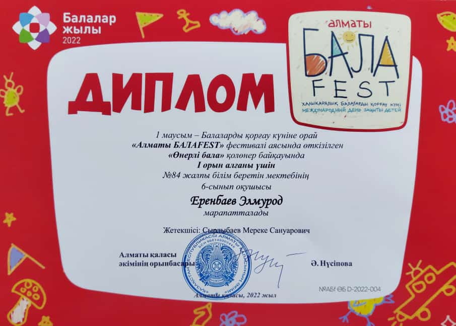 ҚР Президенті Қасым-Жомарт Тоқаевтың биылғы 2022 жылды «Балалар жылы» деп атауы ағымдағы жылға ерекше міндеттер жүктеді. Балалардың шығармашылығын дамыту, белсенділігін жетілдіру мақсатында «Алматы БАЛАFEST» фестивалі аясында өткізілген «Өнерлі бала» қолөнер байқауына №84 ЖББМ 6-сынып оқушысы Еренбаев Элмурод қатысып, І орын диплом иегері атанды (жетекшісі көркем еңбек пәнінің мұғалімі М.С.Сырлыбаев). Осыған орай, «1 маусым – Халықаралық балаларды қорғау» күніне орай ҚР Президенті Қасым-Жомарт Тоқаев аталған фестивальдың салтанатына арнайы қатысып, жүзден жүйрік, мыңнан тұлпар атанған