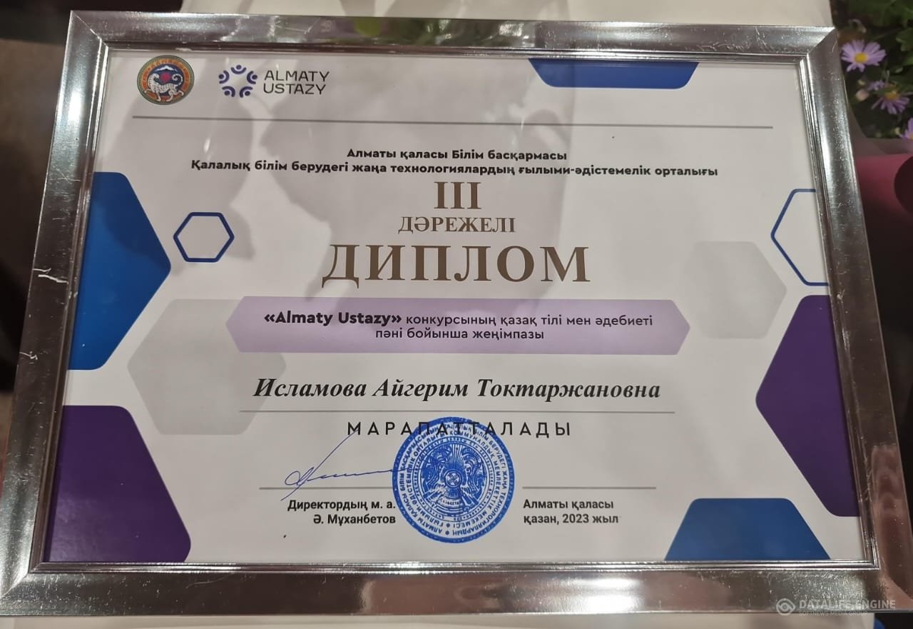 Алматы қалалық "Алматы ұстазы-2023" байқауында топ жарып, ІІІ дәрежелі диплом иегері атанған мектебіміздің қазақ тілі мен әдебиеті пәні мұғалімі Ислам