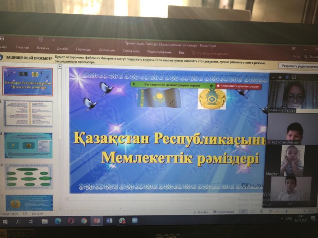 2020-2021оқу жылының 12.10-17.10. аралығындағы тәрбие жұмысының апталық жоспары бойынша 12.10 күні Қазақстан Республикасының мемлекеттік рәміздерін дәріптеу онлайн іс-шарасы өтті