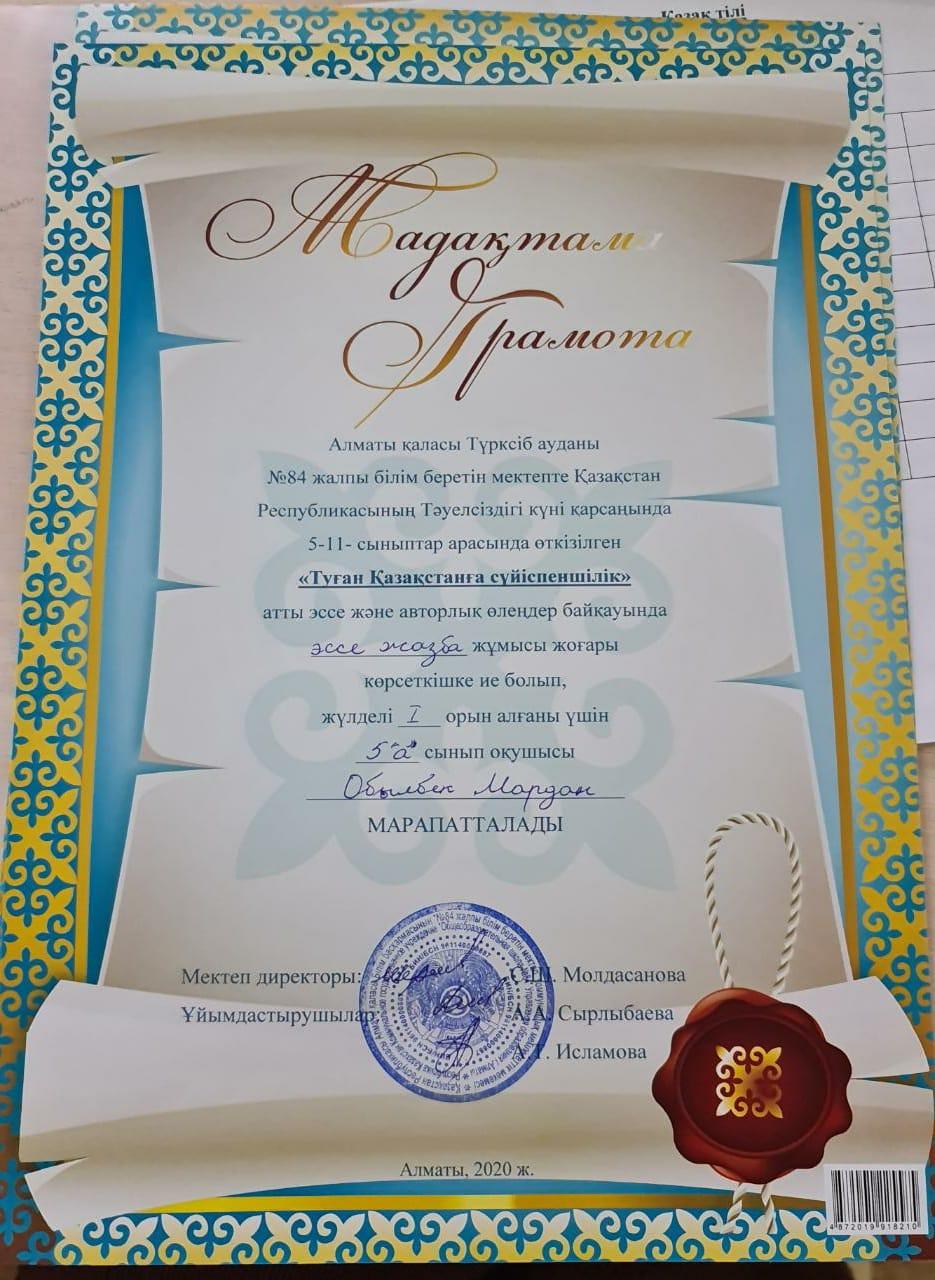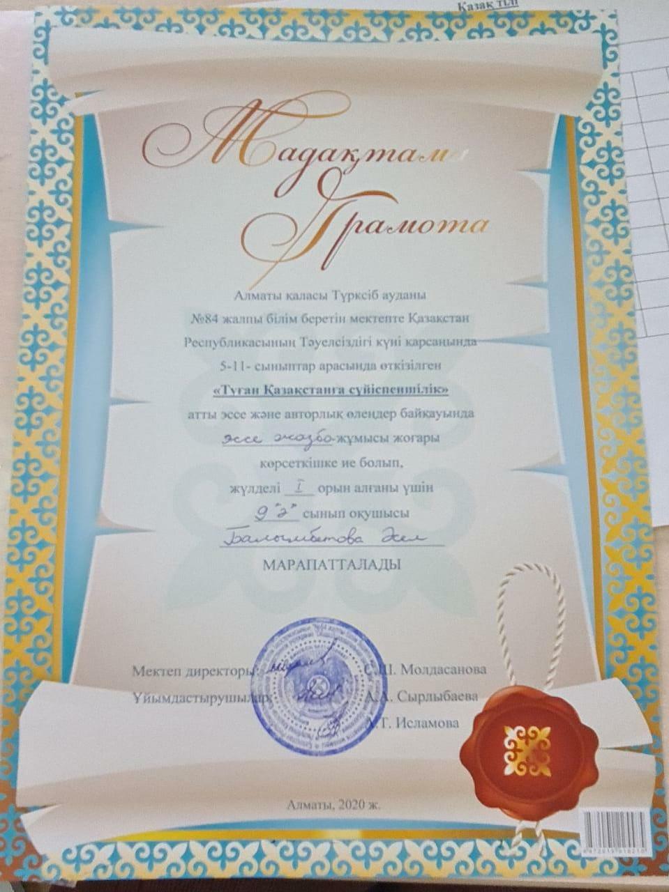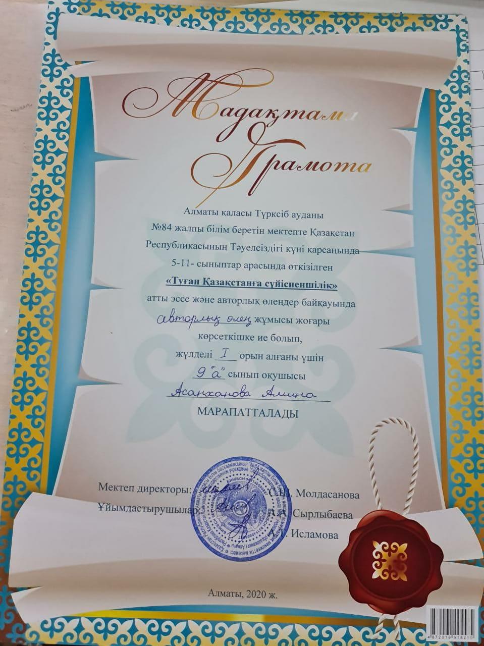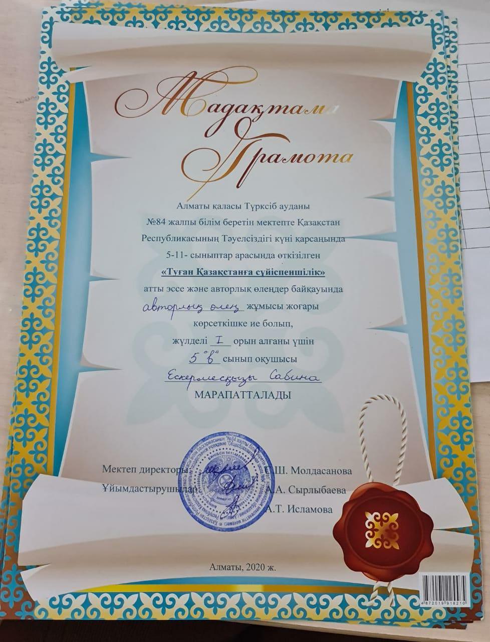 Қазақстан Республикасының Тәуелсіздігі күнін мерекелеу жөніндегі іс-шаралар жоспарына сәйкес Алматы қаласы Түрксіб ауданы №84 жалпы білім беретін мектепте 14.12.2020 ж. күні «Туған Қазақстанға сүйіспеншілік» атты эссе және авторлық өлеңдер байқауы өткізілді. Байқаудың мақсаты: оқушы жастар бойында патриоттық тәрбиені нығайту, туған еліне деген сүйіспеншіліктерін қалыптастырудағы өзіндік шығармашылық әрекет ортасын қалыптастыру. 5-11-сыныптар аралығында ұйымдастырылған аталмыш байқауға 9 авторлық өлең мен 13 эссе жазба жұмысы қатыстырылды.
