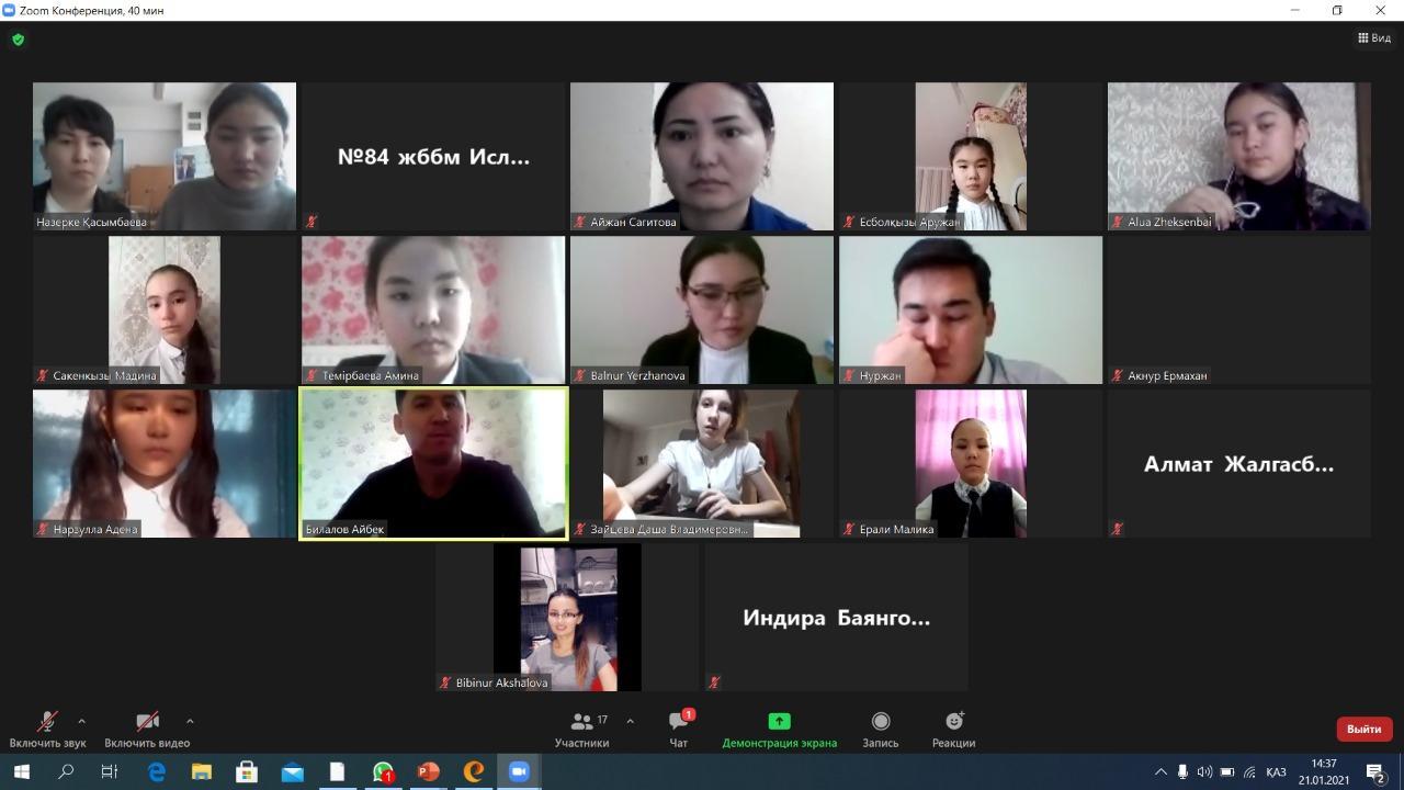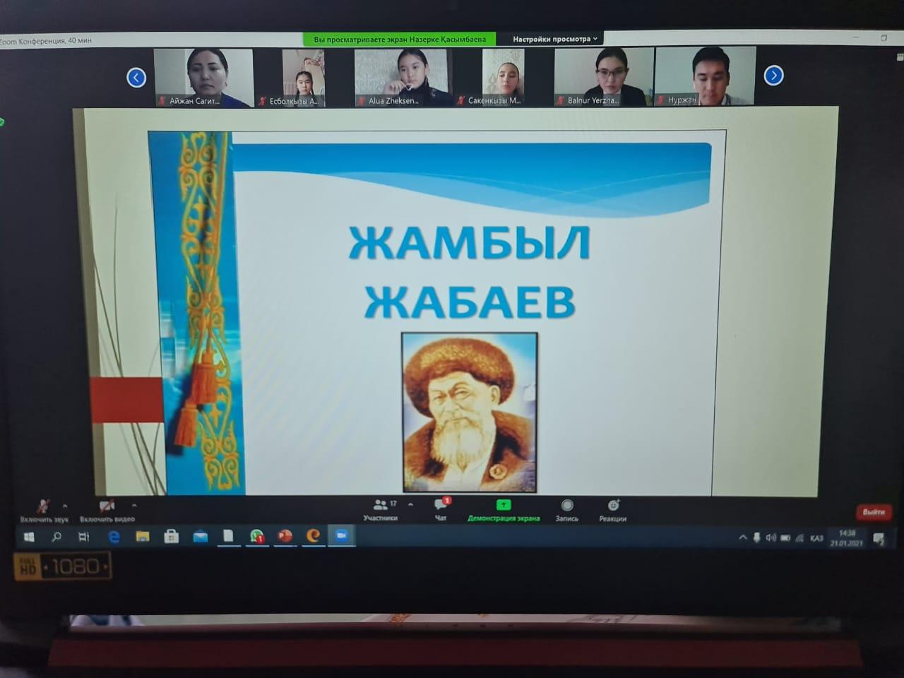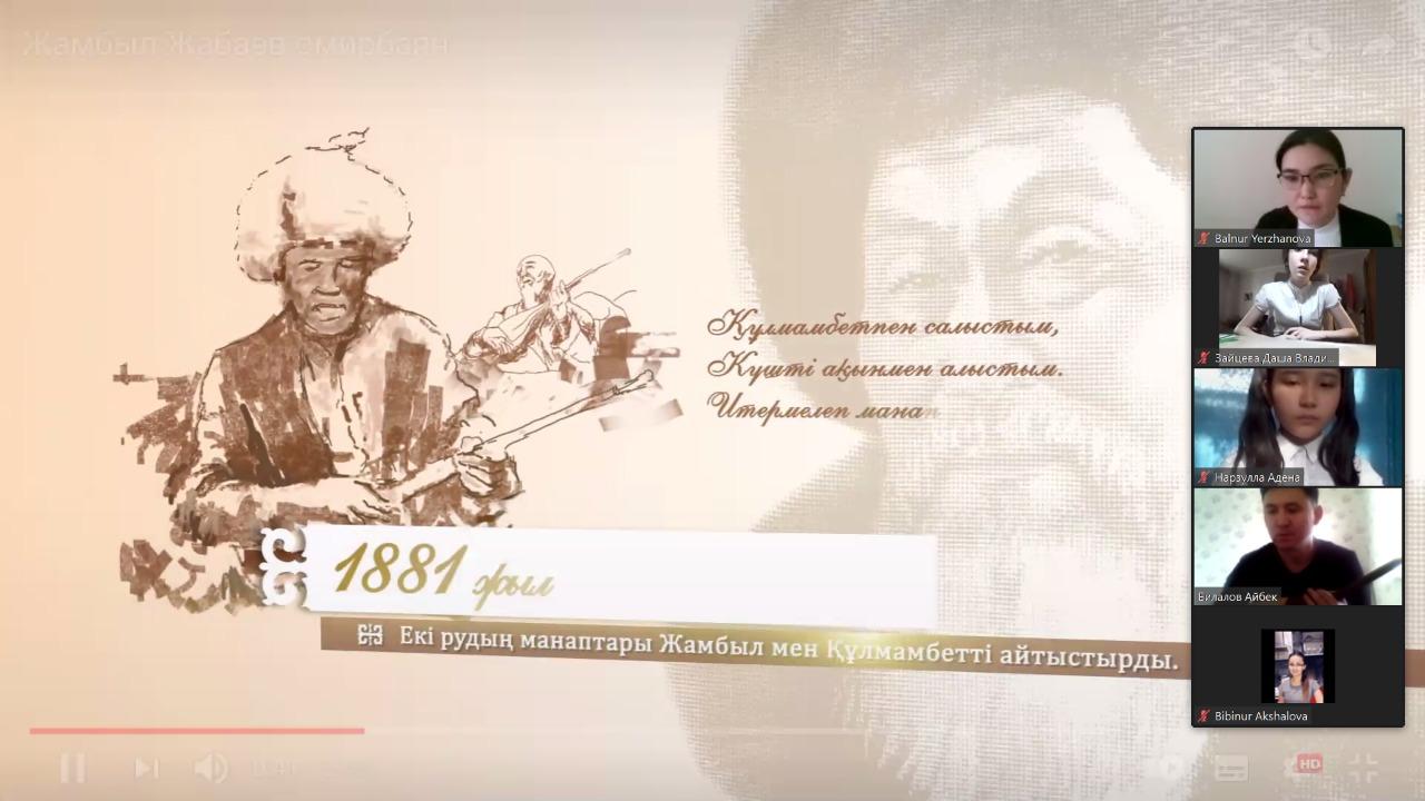Алматы қаласы, Түрксіб ауданы, №84 жалпы білім беретін мектепте қаңтар айының 21- і күні «Жүз жыл жырлаған жүрек» тақырыбында Жамбыл Жабаевтың 175- ж