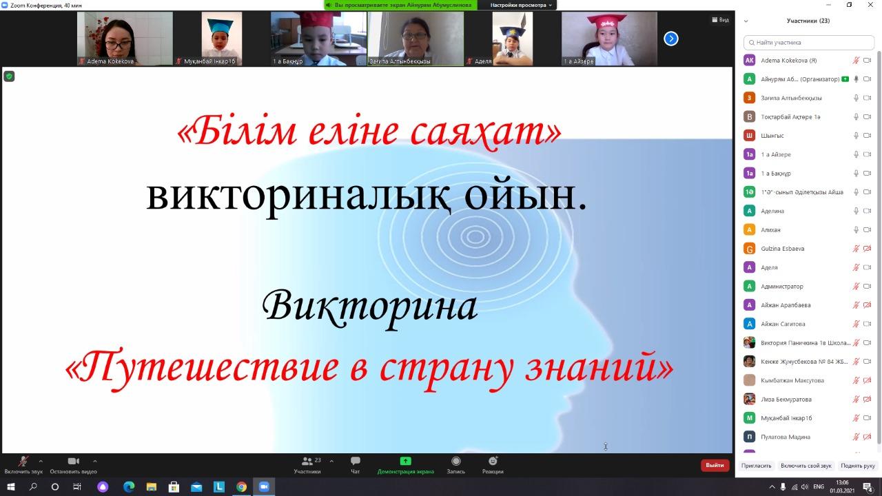 КММ №84 жалпы білім беретін мектепте 1 наурыз 2021 жылы бастауыш сынып әдістеме бірлестігінің онкүндік іс-шарасы аясында 1 сыныптар арасын бастауыш сынып мұғалімдері З.А.Курманбаева мен А.А.Абумуслинованың ұйымдастыруымен "Білім еліне саяхат" атты викториналық ойын өтті. Ойынның мақсаты: 1 сынып оқушыларының білім деңгейін анықтау, меңгерген тақырыптарына қайталау жүргізу. Оқушыларға математика, сауат ашу, жаратылыстану, дүниетану пәндері бойынша сұрақтар қойылды.Қатысушылар ойынға белесене қатысты, әр оқушыға белсене қатысқаны үшін мадақтама берілді.