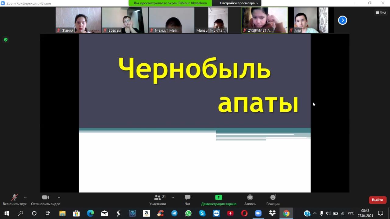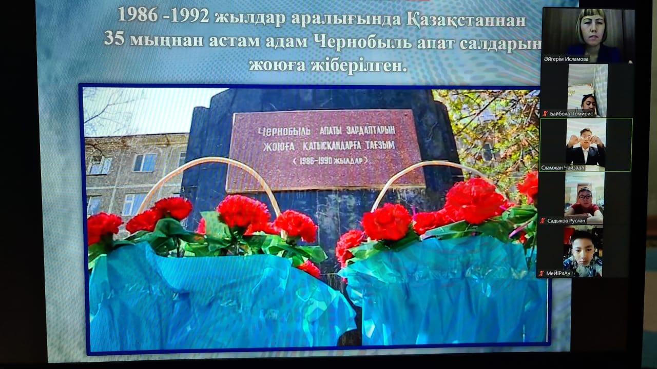 Алматы қаласы Түрксіб ауданы №84 ЖББ мектепте 20.04.2021 ж. №131 кіріс хаты негізінде Чернобыль апатының 35 жылдығына арналған «Чернобыль жаңғырығы»