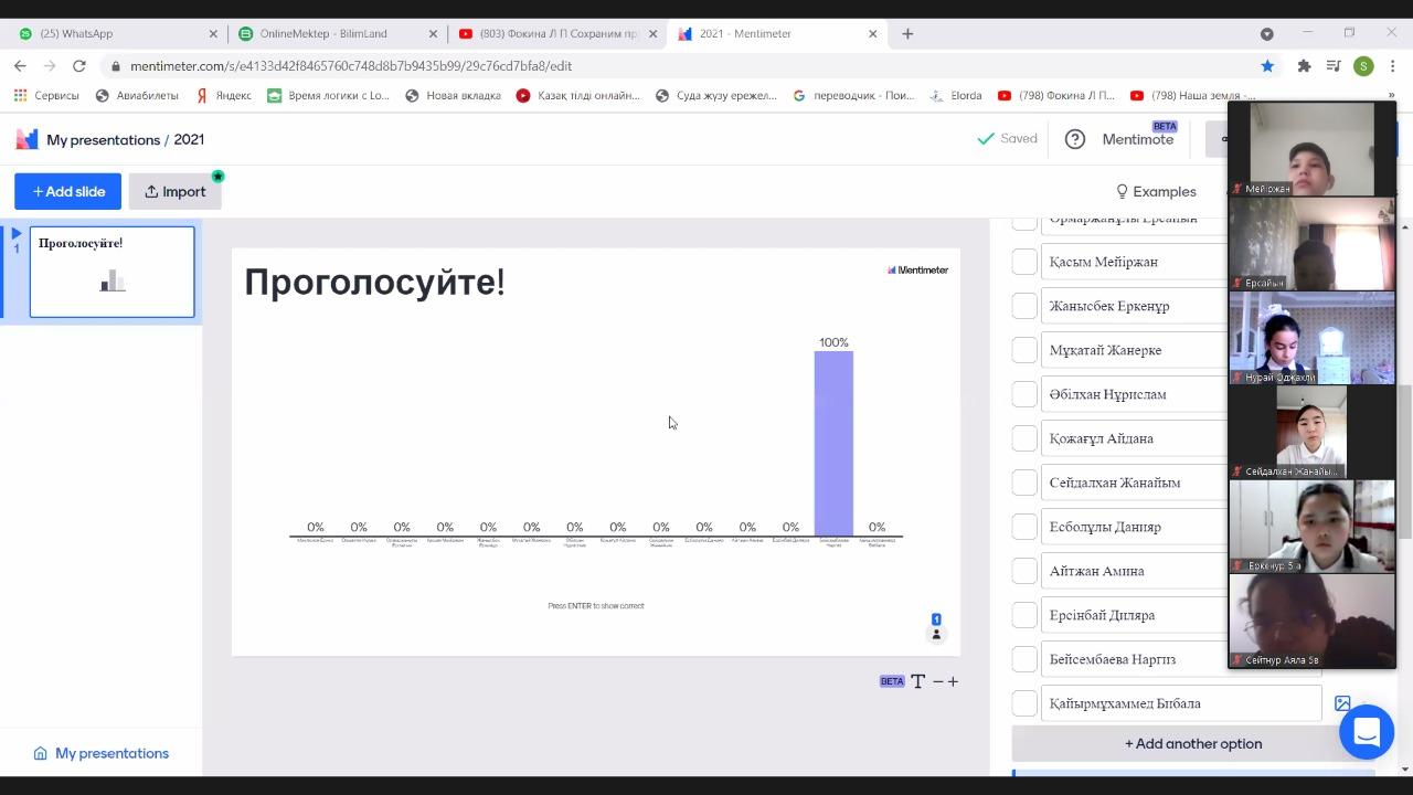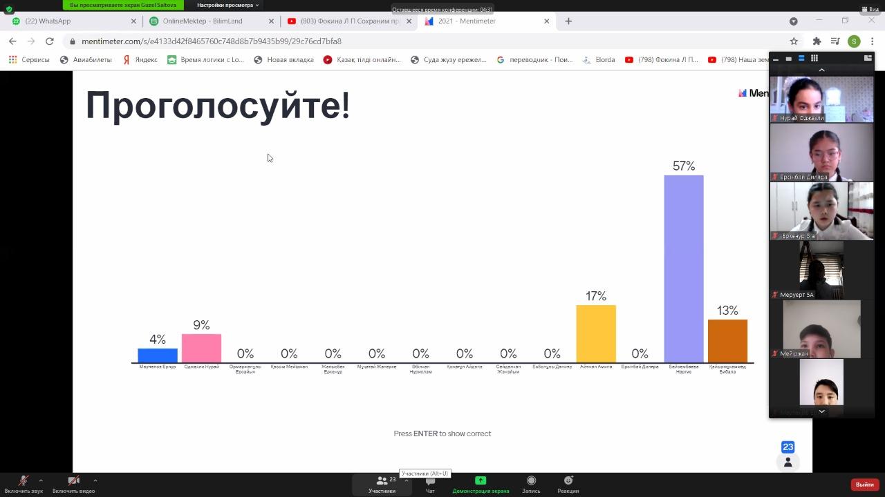 Алматы қаласы Түрксіб ауданы №84 ЖББ мектепте Экологиялық білім берудің жалпыреспубликалық апталығының жоспарына сәйкес 27.04.2021 ж. мектебіміздің орыс тілі пәні мұғалімі Г.К.Саитованың ұйымдастыруымен "Табиғат аясындағы Мен! " тақырыбында 5 сыныптар арасында мәнерлеп оқу сайысы өткізілді. Мәнерлеп оқу сайысы орыс тілінде жүргізіліп, оқушылар орыс тілінде өлең жолдарын оқыды.