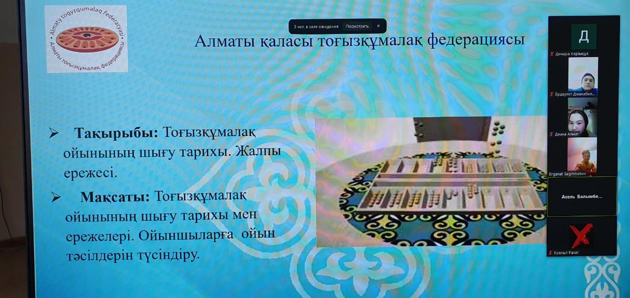 лматы қаласы Түрксіб ауданы №84 ЖББ мектебінде күзгі демалысты тиімді өткізуге арналған жоспарға сәйкес 05.11.2020 ж. Интеллектуалды бағыт бойынша "Тоғызқұмалақ ойнаймын" атты онлайн кездесу өткізілді. Онлайн кездесу Алматы қаласы тоғызқұмалақ федерациясының төрешілер алқасын басқарушысы, Түрксіб ауданының тоғызқұмалақтан бас жаттықтырушысы Бибеков Еркебұлан Қуандықұлы қатысып, балаларға ойын туралы қызықты деректермен, қыр-сырымен таныстырды.