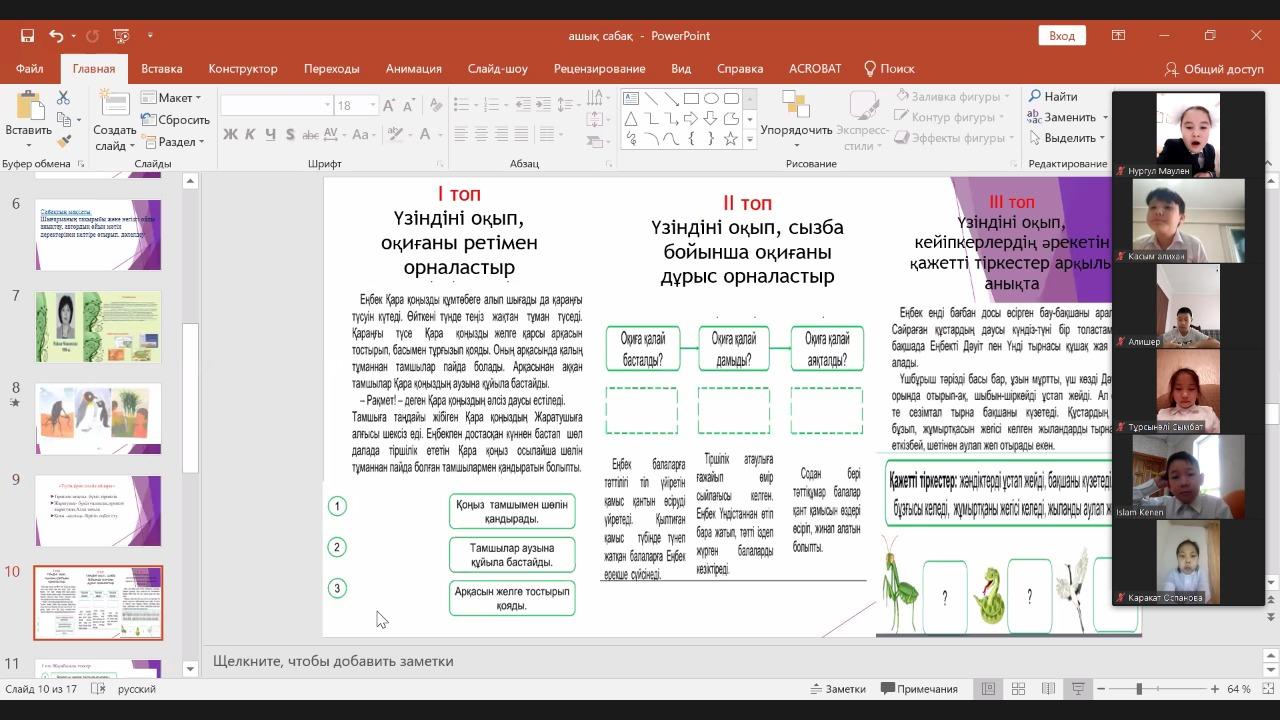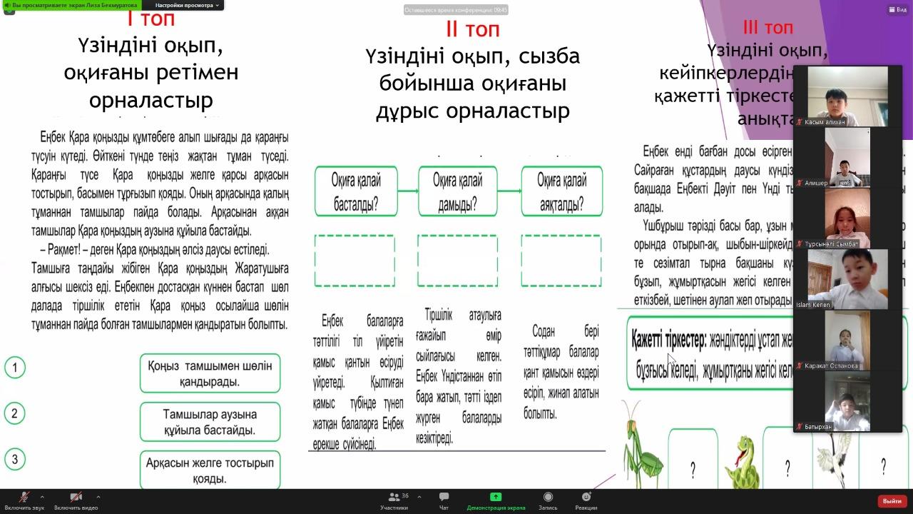 Бастауыш сынып әдістеме бірлестігінің өтіп жатқан онкүндігінің үшінші күнін 4"Ә" сынып жетекшісі және бастауыш сынып мұғалімі Бекмуратова Лиза Абдималиковна әдебиеттік оқу пәнінен "Тіршілік көзі еңбекте"деген тақырыпта ашық сабағымен жалғады. Сабақты зум флотформасында өткізіп, әр түрлі әдіс -тәсілдерді қолдана отырып,балалардың қызығушылығын арттыру мақсатында жаңа технологиялар мен әдіс -тәсілдерін қолданды.Сабақ жоғарғы дәрежеде өтті.