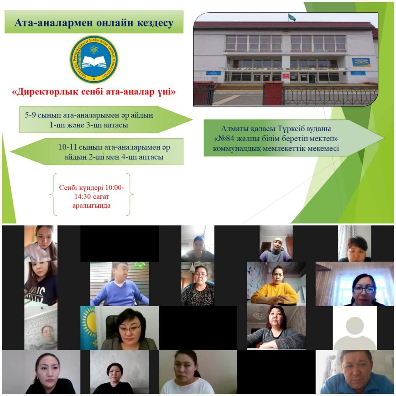 Алматы қаласы Түрксіб ауданы №84 ЖББ мектепте ақпан айының 27 күні «Директорлық сенбі – ата - ана үні» атты тақырыбында 10 сынып ата - аналарымен жиналыс өтті. Күн тәртібінде келесі мәселелер қаралды: