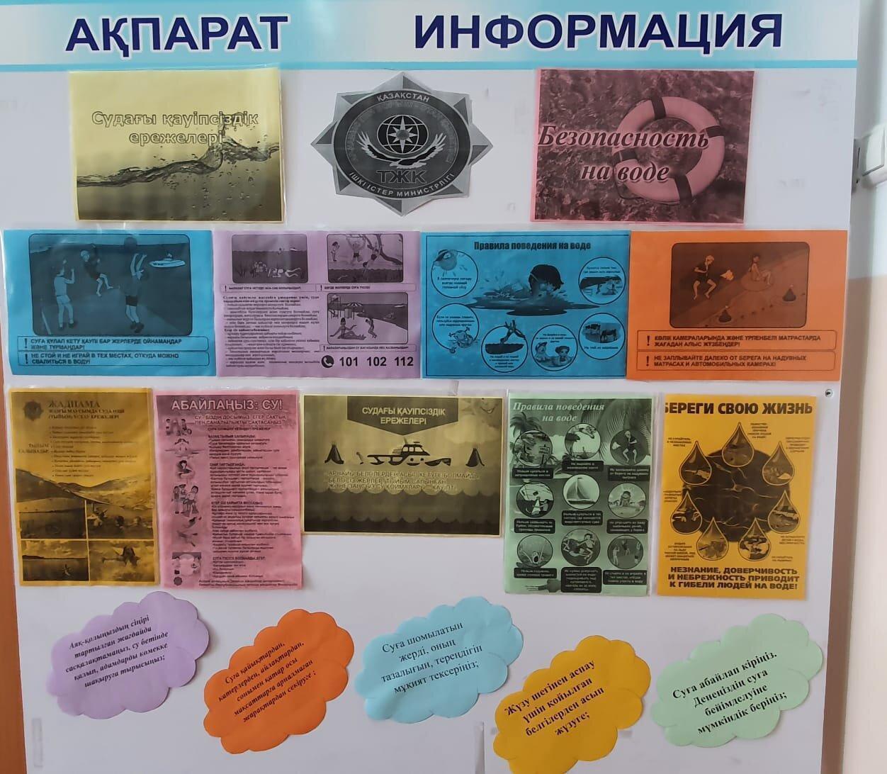 Алматы қаласы Түрксіб ауданы №84 жалпы білім беретін мектепте 21.04.2021ж. судағы қауіпсіздіктің алдын алу мақсатында мектепте стенд дайындалды. Стендттегі ақпараттар екі тілде ілінді.