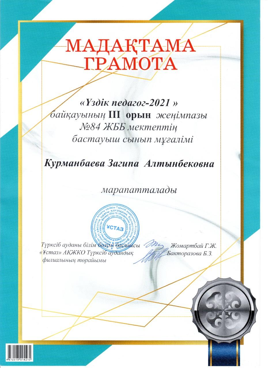 Алматы қаласы Түрксіб аудандық білім бөлімі және Түрксіб аудандық "Ұстаз" АҚЖКО филиалы ұйымдастырған "Үздік педагог - 2021" байқауына мектебіміздің бастауыш сынып мұғалімі Құрманбаева Загипа Алтынбековна қатысып жүлделі ІІІ 🥉 орынды иеленді. Жеңісіңіз құтты болсын!!!