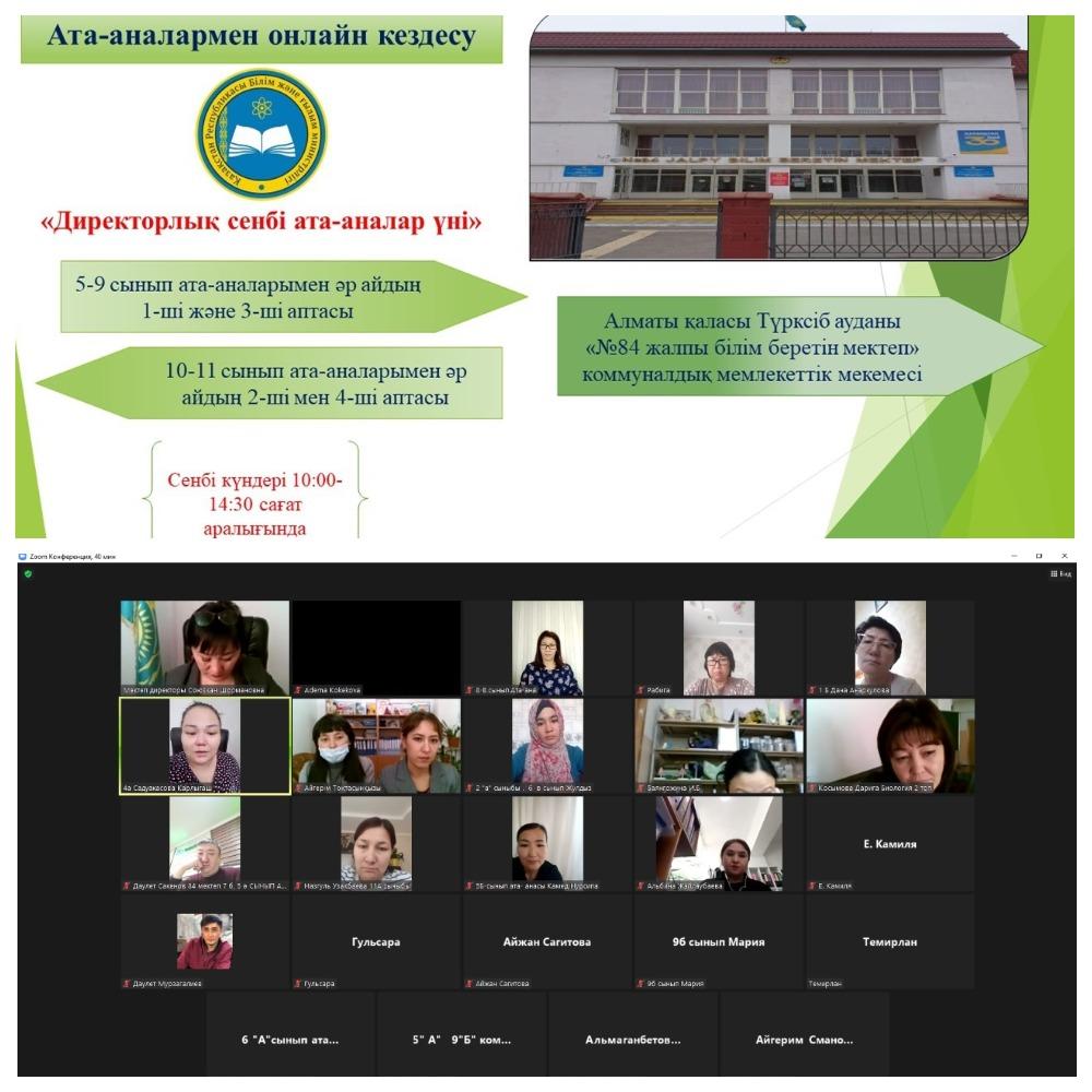 Алматы қаласы Түрксіб ауданы №84 ЖББ мектепте қараша айының 27 күні "Директорлық сенбі ата-ана үні" атты ата-аналарымен жиналыс өтті. Күн тәртібінде: Оқушылардың 1 тоқсандағы оқу – тәрбие жетістіктері. Мектептің санитарлық жағдайы және Ата – аналарды толғандырып жүрген сұрақтар.