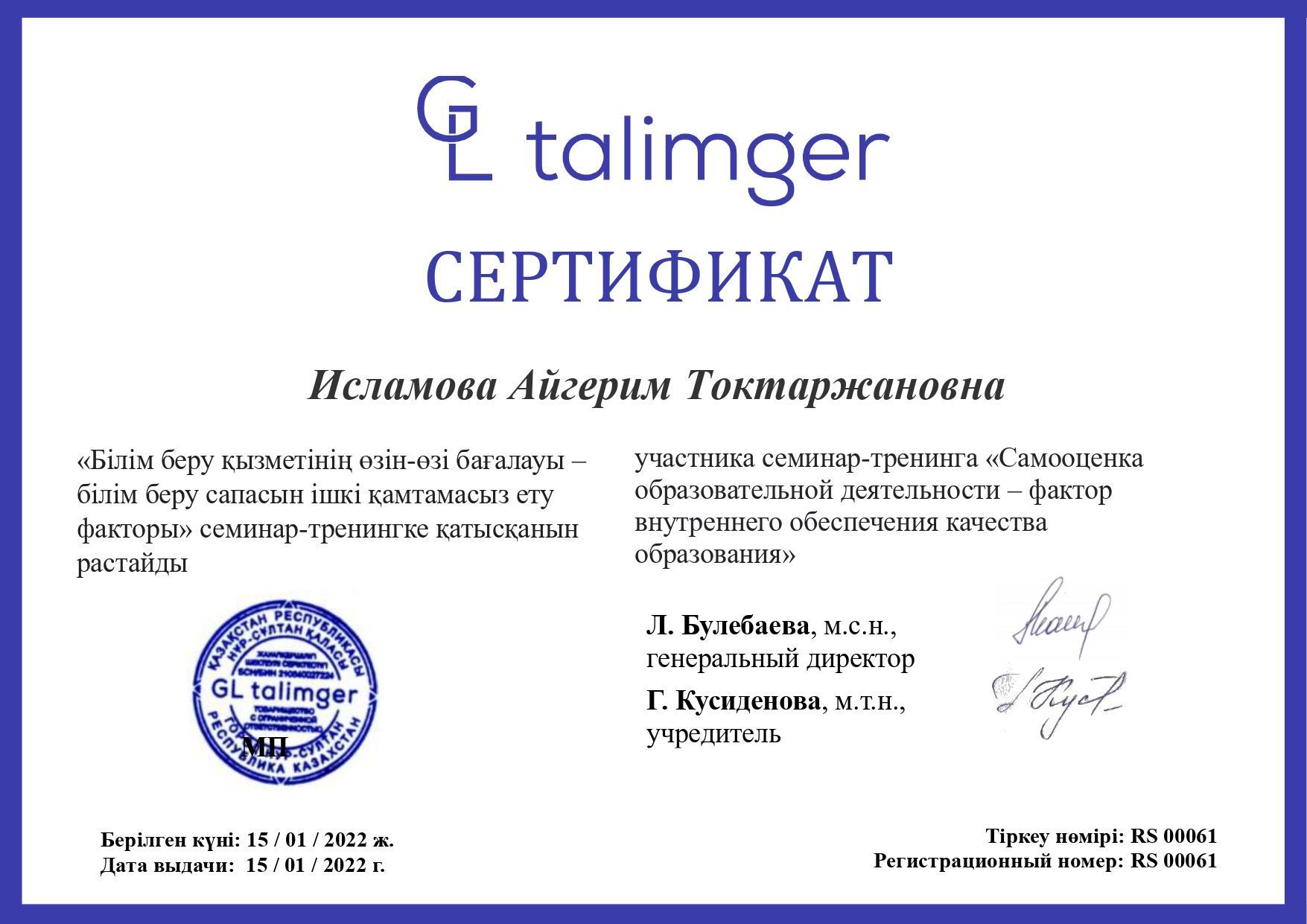 Алматы қаласы Түрксіб ауданы №84 жалпы білім беретін мектептің директордың оқу ісі жөніндегі орынбасары Джакупова Алтынай Амирхановна және қазақ тілі мен әдебиеті пәнінің мұғалімі Исламова Айгерим Токтаржановна "Білім беру қызметінің өзі-өзі бағалауы - білім беру сапасын ішкі қамтамасыз ету факторы" атты семинар-тренингке қатысып, сертификат алды. Біліктілік қоржынындағы аталған бағыт кәсіби шеберліктерінің өсуіне септесе берсін!