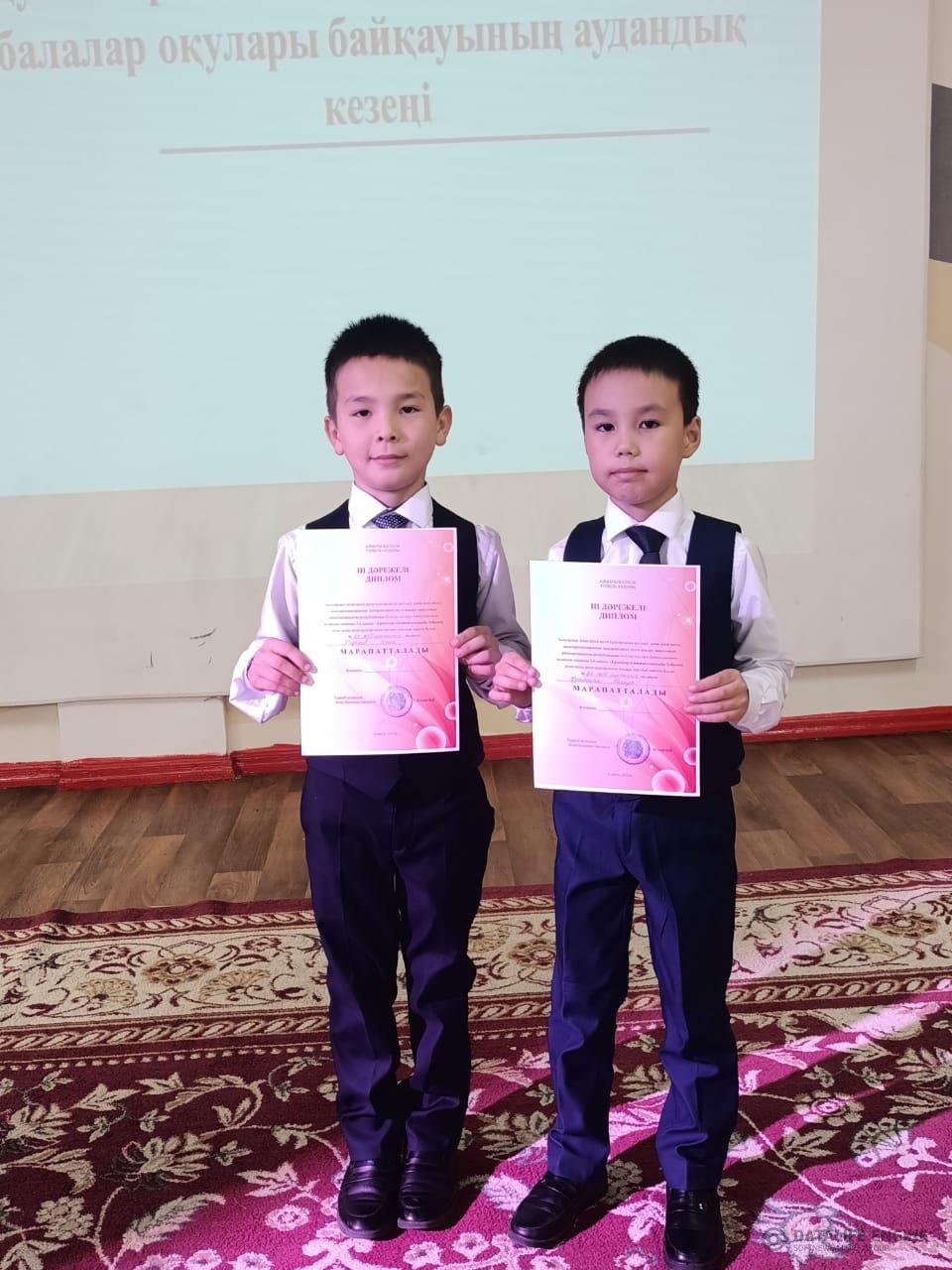 Балаларды кітап оқуға деген құштарлығын арттыру, қазақ және шетел ақын-жазушыларының шығармаларын оқуға шақыру мақсатында ұйымдастырылған республикалық балалар оқулары байқауларының аудандық кезеңінің «Ертегілер әлемінде» тақырыбы бойынша кітап оқуға деген құштарлығын жоғары деңгейде көрсете білген 3 «А» сынып оқушысы Қуанышбек Бақнұр ІІІ дәрежелі диплом, 4 «А» сынып оқушысы Таубаев Оспан ІІІ дәрежелі дипломмен, 7 – 8 сынып «Ғасырлар тарихы жырлайды» тақырыбы бойынша 7 «Ә» сынып оқушысы Базарбай Жасмин ІІ дәрежелі дипломмен марапатталды. Құттықтаймыз!!!