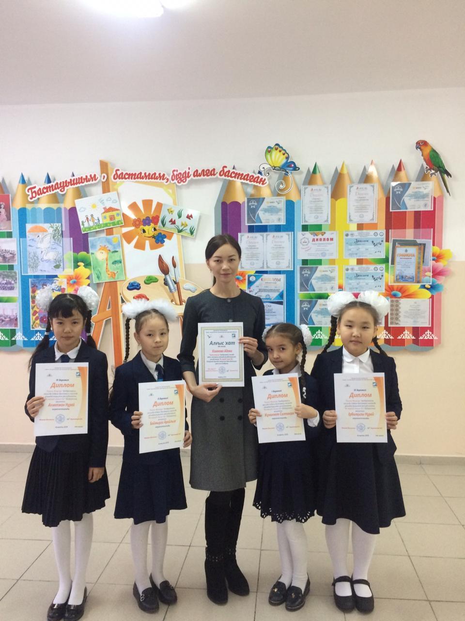 «Izdenіs» respýblıkalyq oqytýshylar men oqýshylar portaly «Rýhanı jańǵyrý» baǵdarlamasy aıasynda Elbasy bastamasy negіzіnde uıymdastyrylǵan respýblıkalyq «Óz jerіńdі tanyp bіl» baıqaýynyń qorytyndysy boıynsha 4 «A» synyp oqýshylary Jumahmet Saltanat I dárejelі, Baımyrza Araılym II dárejelі, Ahmetjan Nuraı, Erbolqyzy Nuraı III dárejelі dıplommen marapattaldy. Baıqaýǵa daryndy shákіrt daıyndaǵany úshіn Adema Abeýgalıevna «Alǵys hatpen» marapattaldy.