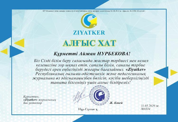 Алматы қаласы, 84 жалпы білім беретін мектептің 1 “А” сынып оқушыларының қашықтықтан оқыту кезіндегі білімдерінің шыңдалып жатқандығы, түрлі Республика көлеміндегі олимпиадалар мен байқаулардан алып жатқан жетістіктері туралы Нурбекова Айжан Айдарханқызының мақаласы Республикалық ғылыми-әдістемелік және педагогикалық “ZIYATKER” журналына жарияланды. Құтты болсын!