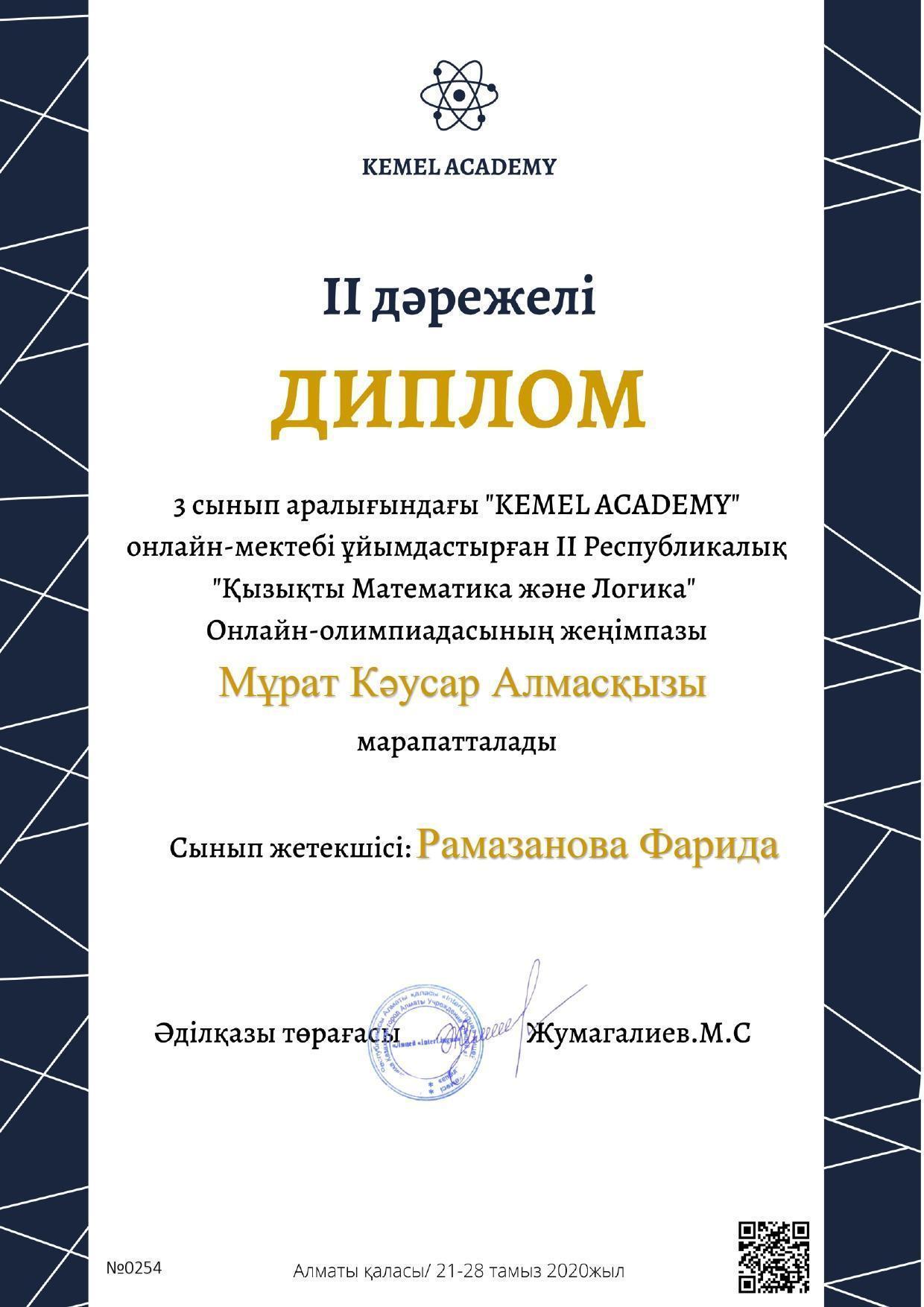 Алматы қаласы Түрксіб ауданы №84 ЖББ мектептің 3 "В" сынып оқушысы Мұрат Кәусар Алмасқызы "KEMEL ACADEMY" онлайн-мектебі ұйымдастырған II Республикалы