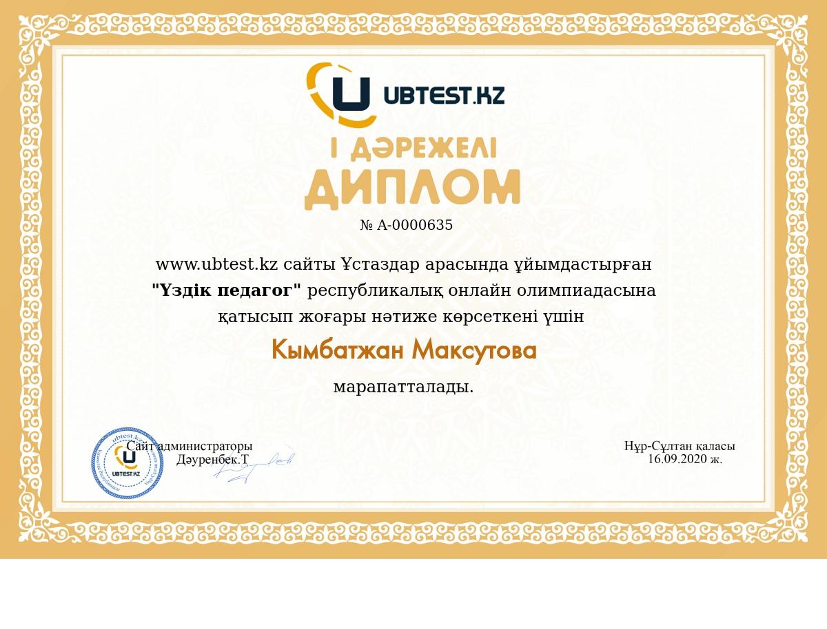 www.ubtest.kz сайты Ұстаздар арасында ұйымдастырған "Үздік педагог" республикалық онлайн олимпиадасына қатысып жоғары нәтиже көрсеткені үшін Максутова