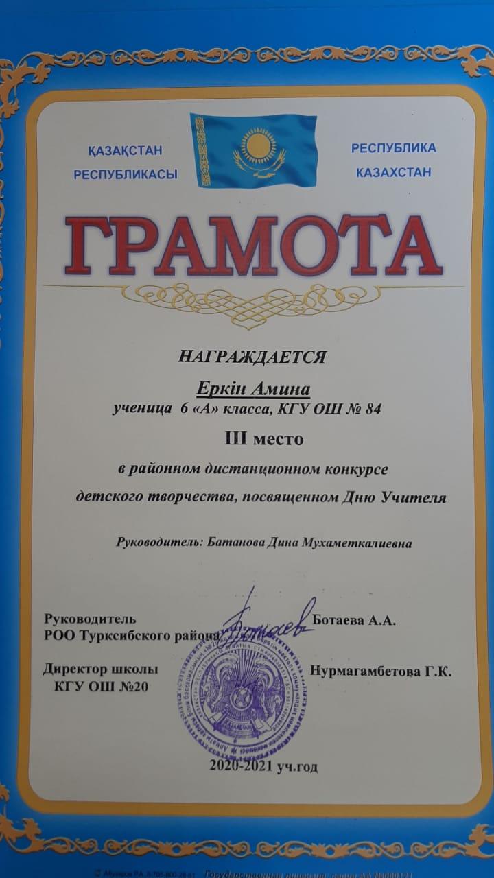 Ученица 6 "Ә" класса Еркін Амина заняла III место в районном дистанционном конкурсе детского творчества, посвященном Дню Учителя. Руководитель: Батанова Д.М