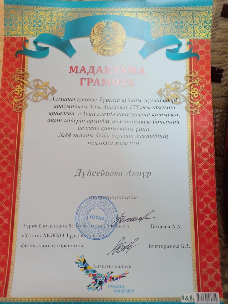 Алматы қаласы Түрксіб ауданы "Ұстаз" АҚЖКО ұйымдастырған мұғалімдер арасында Ұлы Абайдың 175 жылдығына арналған "Абай әлемі" конкурсына қатысып, ақын әндерін орындау номинациясы бойынша белсене қатысқаны үшін №84 ЖББ мектептің психолог мұғалімі Дүйсебаева Ақнұр Амирханқызы марапатталды. Биік белестерден көріне беріңіз!!!