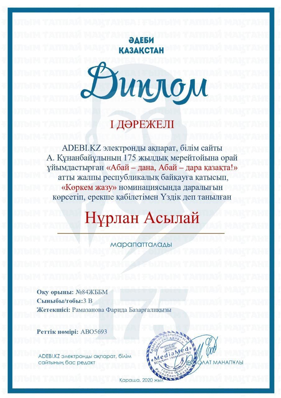 «ADEBI.KZ» интеллектуалды порталы Республика деңгейінде интернет байқауын ұйымдастырды. Байқаудың мақсаты: Абай Құнанбайұлының шығармаларын білім алушылардың арасында кеңінен насихаттау. Жастардың бойындағы Қазақ еліне деген құрметті күшейту, патриоттық сезімді арттыру.Абай Құнанбайұлының 175 жылдық мерейтойына орай «Абай дана – Абай дара қазақта!» атты жалпы республикалық байқауға қатысып, «Көркем жазу» номинациясында даралығын көрсетіп ерекше қабілетімен Үздік деп танылған Алматы қаласы Түрксіб ауданы №84 ЖББМ 3 «В»сынып оқушысы Нұрлан Асылай бірінші жүлделі орынмен марапатталды.Сынып жетекшісі:Рамазанова Фарида Базарғалиқызы. Жеңісіңіз құтты болсын