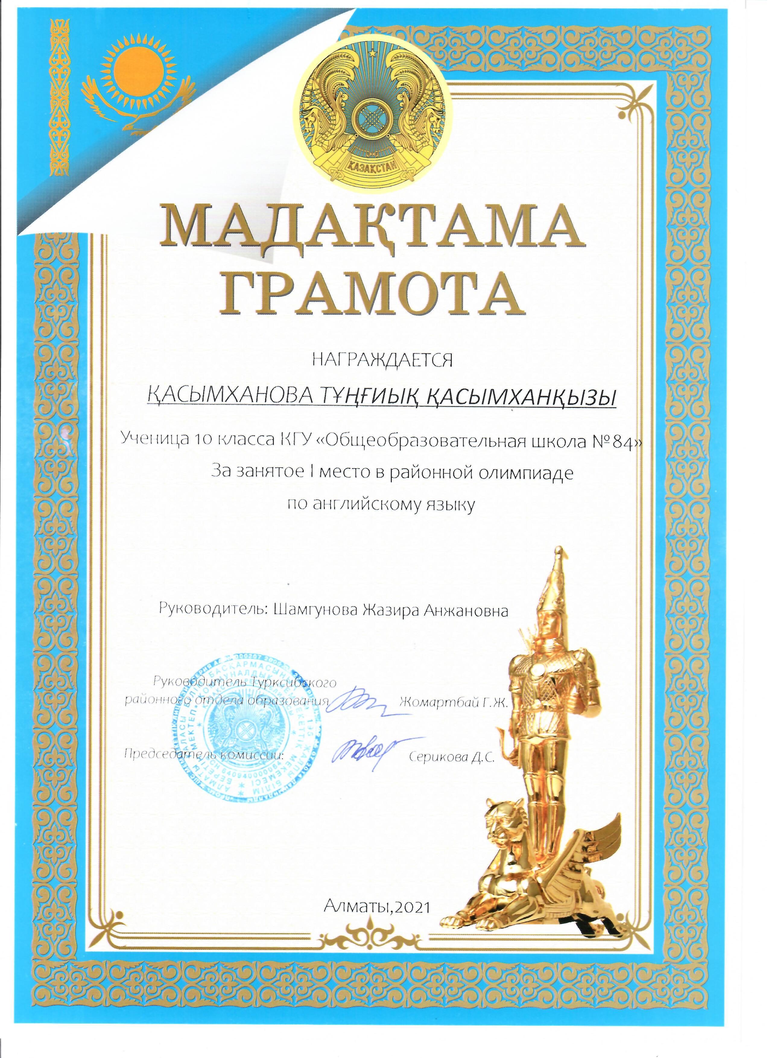 Награждается ученица 10 "А" класса КГУ ОШ №84 Турксибского района г.Алматы Қасымханова Тұңғиық занявшая І место в районной олимпиаде по английскому яз