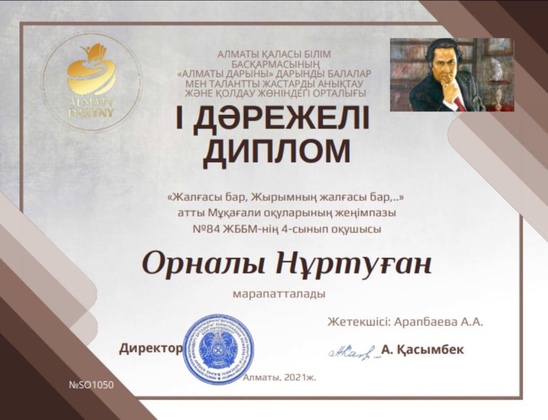 Алматы қаласы Білім басқармасының “Алматы дарыны”дарынды балалар мен талантты жастарды анықтау және қолдау жөніндегі орталығы өткізген “Жалғасы бар,Жырымның жалғасы бар...”атты Мұқағали оқуларына 4”А” сынып оқушысы Орынбасар Айзере қатысып,ll дәрежелі дипломмен,Орналы Нұртуған l дәрежелі дипломмен марапатталды.