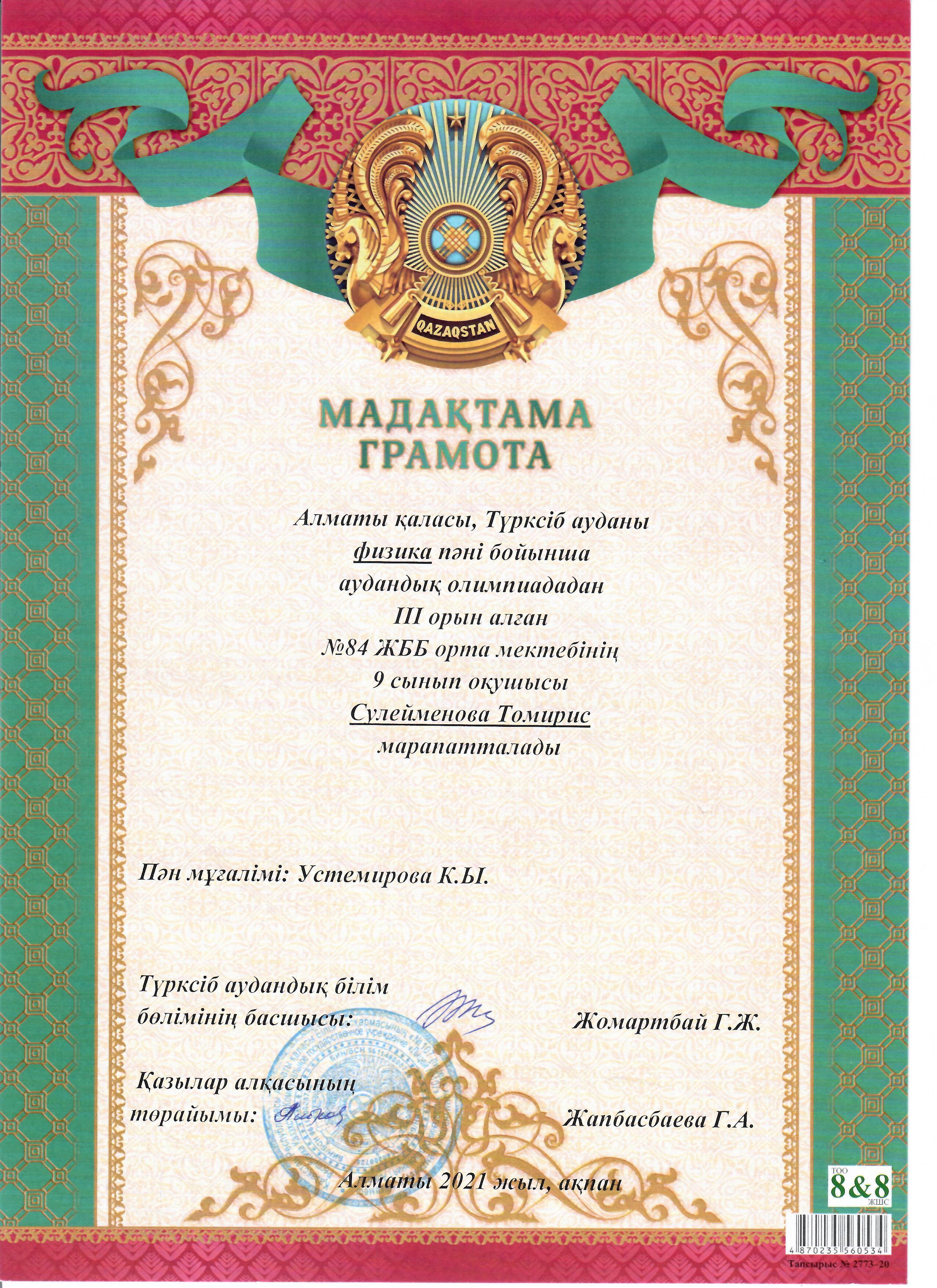 Алматы қаласы Түрксіб ауданы физика пәні бойынша аудандық олимпиададан ІІІ орын алғаны үшін №84 ЖББ мектептің 9 "А" сынып оқушысы Сулейменова Томирис