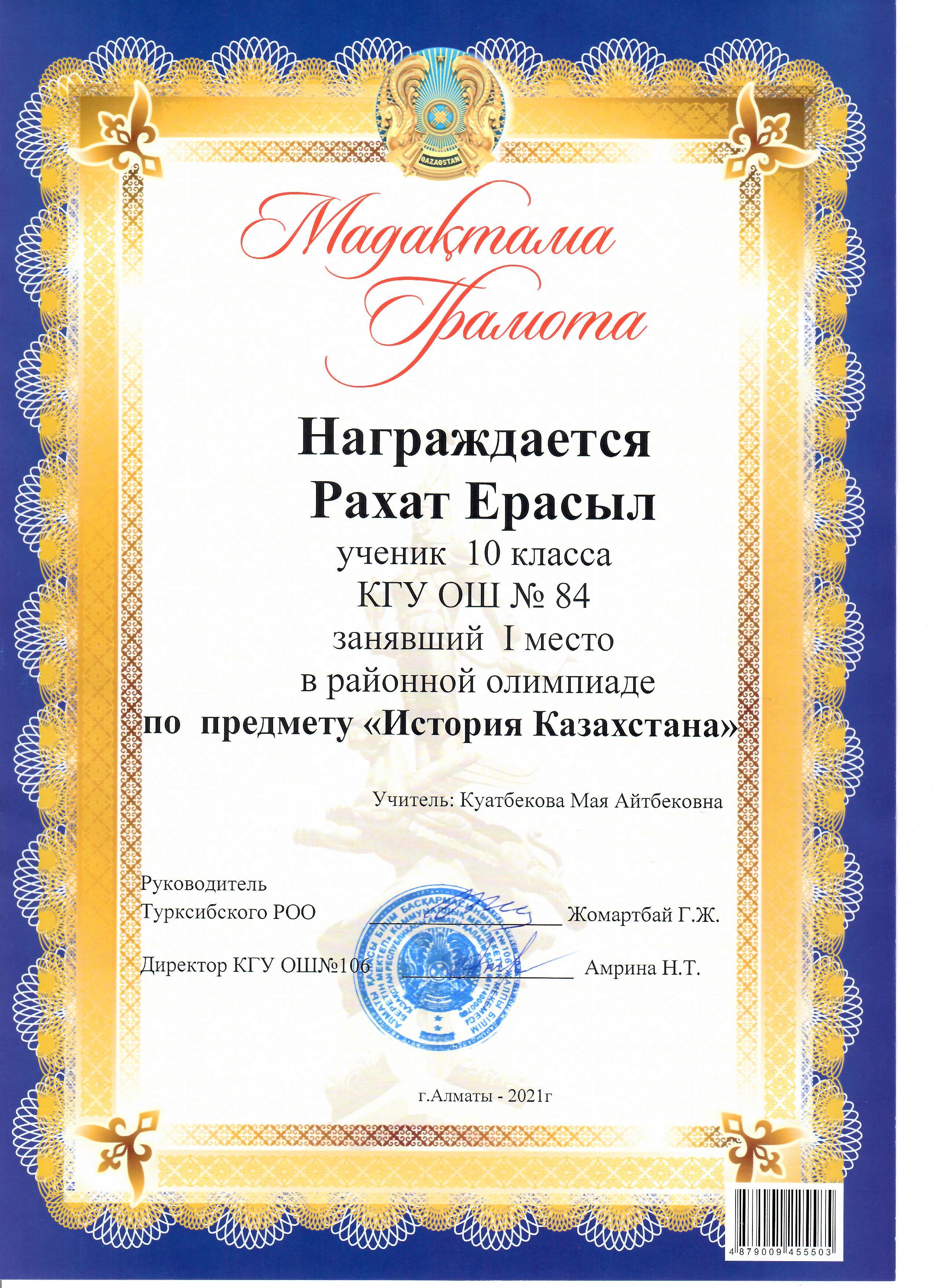 Награждается ученик 10 "А" класса Рахат Ерасыл КГУ ОШ №84 занявши І место в районном туре Республиканской олимпиады по предмету "История Казахстана" и