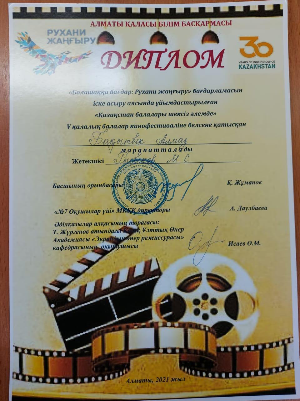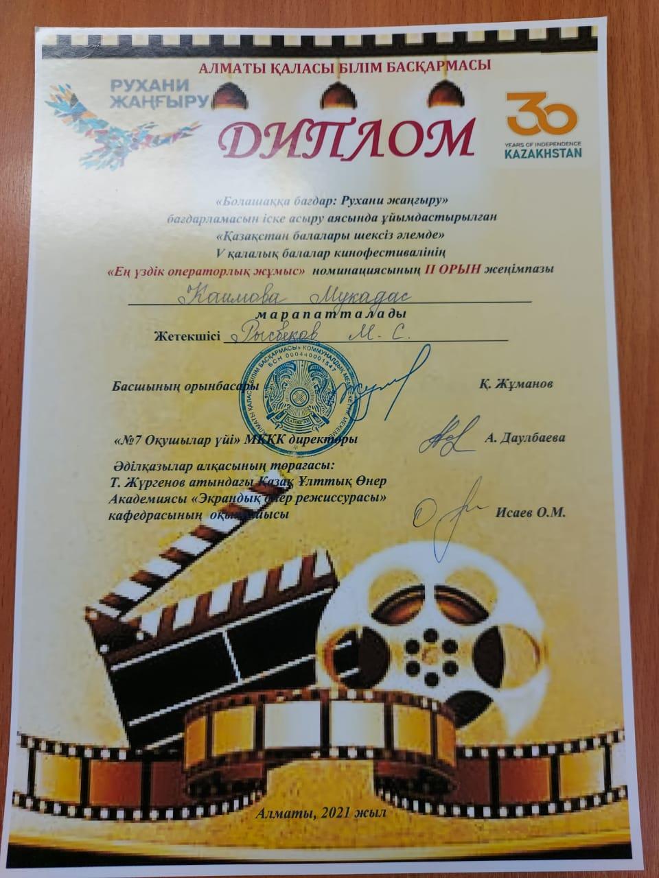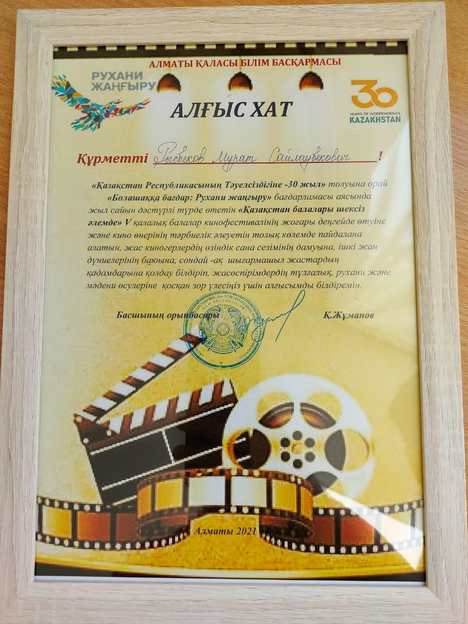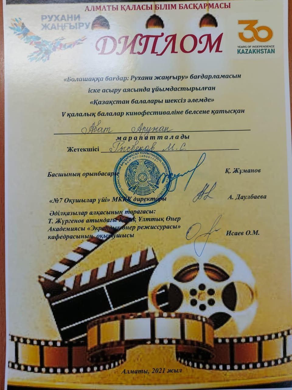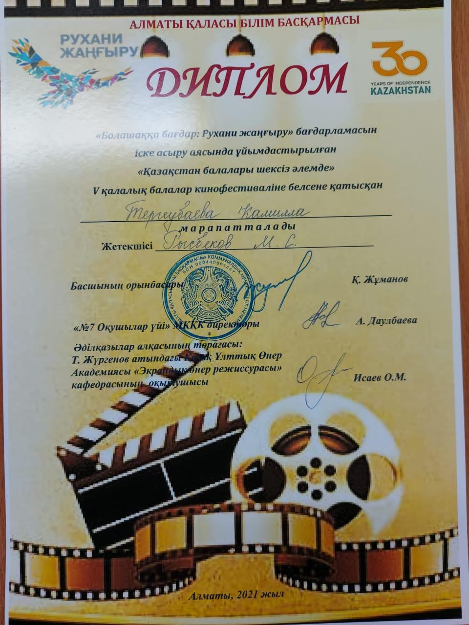 "Болашаққа бағдар: Рухани жаңғыру" бағдарламасын іске асыру аясында ұйымдастырылған "Қазақстан балалары шексіз әлемде" V қалалық балалар кинофестиваліне белсене қатысқаны үшін мектебіміздің 11"А" сынып оқушылары Бақытбек А, Тергеубаева К, 11"Ә" сынып оқушылары Абат А, Каимова М дипломмен марапатталды. Жетекшісі Рысбеков М.С