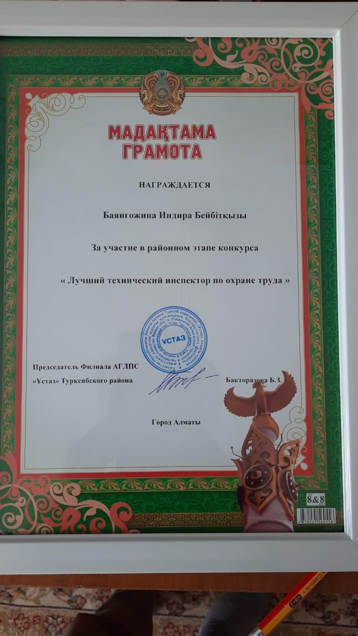 29 апрель 2021 0 1 2 3 4 5 Награждается Баянгожина Индира Бейбітқызы за участие в районном этапе конкурса "Лучший технический инспектор по охране труда" Награждается Баянгожина Индира Бейбітқызы за участие в районном этапе конкурса "Лучший технический инспектор по охране труда"