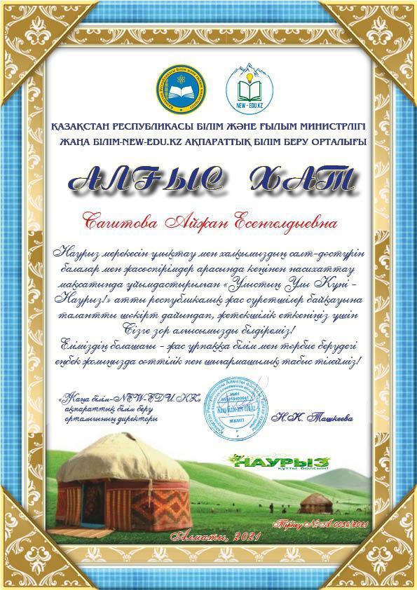 «Жаңа білім – new-edu.kz» ақпараттық білім беру орталығының балалар мен жасөспірімдер арасында өткен «Ұлыстың Ұлы күні – наурыз!» атты жас суретшілер