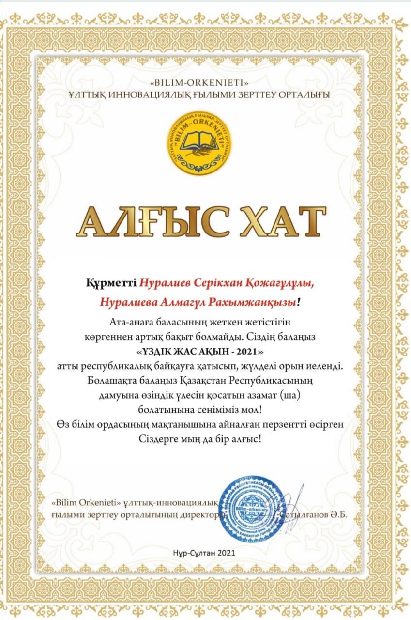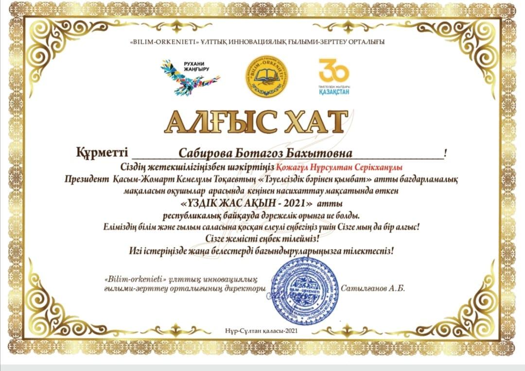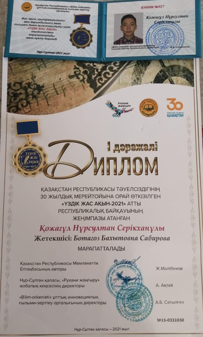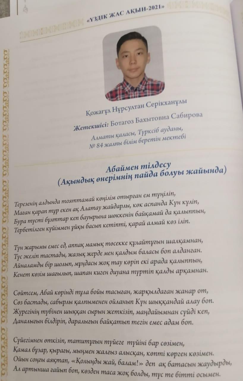 Алматы қаласы Түрксіб ауданы №84 ЖББ мектептің 11 "А" сынып оқушысы Қожағұл Нұрсұлтан Қазақстан Республикасы Тәуелсіздігінің 30 жылдық мерейтойына орай өткізілген "Үздік жас ақын -2021" атты Респубилкалық байқауына қатысып, жас ақын , шығармашылығы мен дарындылығы және поэзияға деген қызығушылығы үшін "Үздік Жас Ақын" төсбелгісі куәлігімен және 1 дәрежелі дипломмен марапатталды. Жетекшісі: Б.Б.Сабирова. Жауапты: ДОІЖО Джакупова А.А