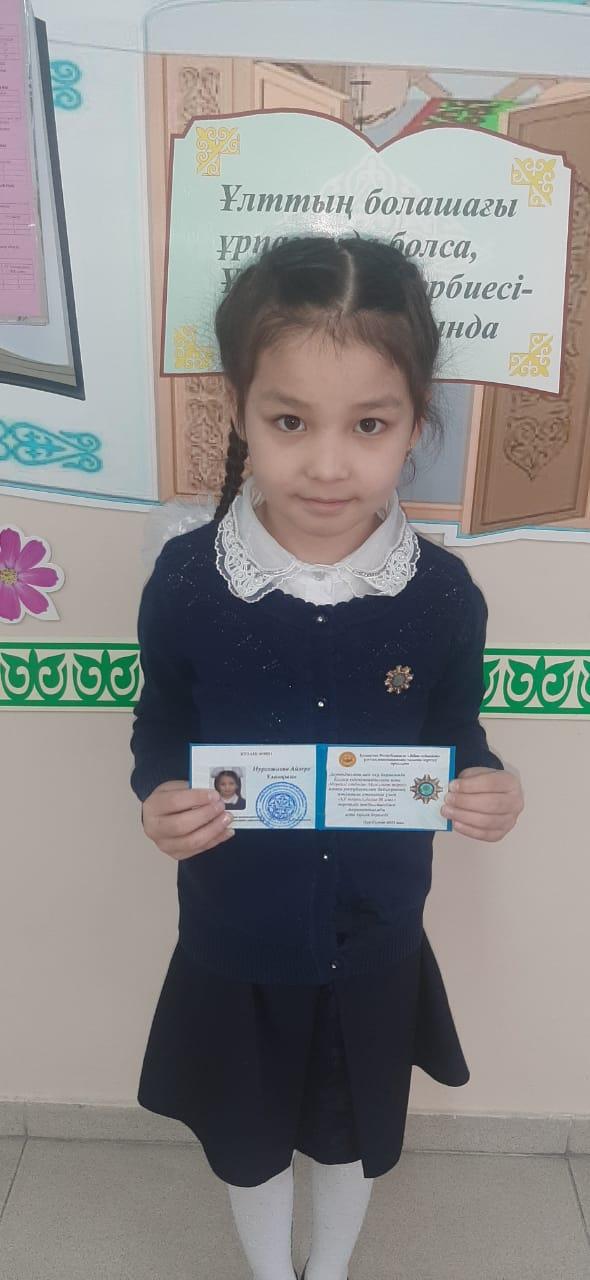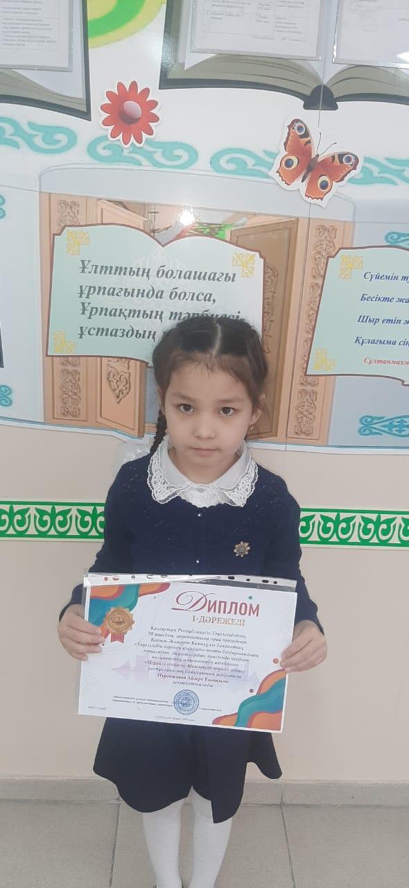 Қазақстан Республикасы тәуелсіздігінің 30 жылдық мерейтойына орай " Мерейлі отбасы - мемлекет тірегі" атты республикалық байқауға қатысып 2 " Б" сынып оқушысы Нургожаева Айзере дарындылығы мен оқу барысында білімге ізденімпаздығы үшін " ҚР тәуелсіздігіне 30 жыл " төсбелгішесімен және куәлігімен,І дәрежелі дипломмен марапатталды. "Мерейлі отбасы-мемлекет тірегі" атты республикалық дарынды оқушыларға арналған жинаққа "Отбасым-асыл қазынам" мақаласы жарияланды.