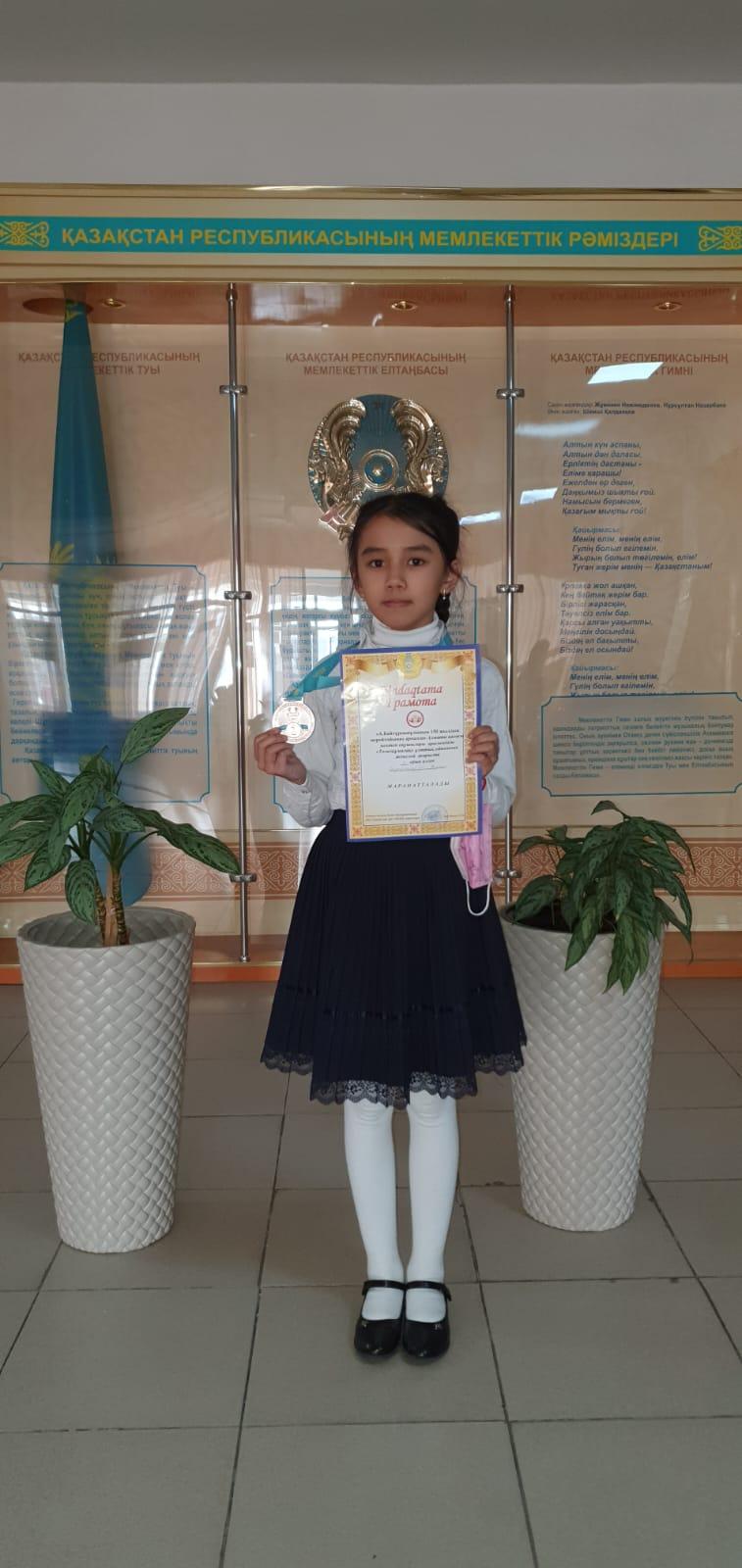 А. Байтұрсынұлының 150 жылдық мерейтойына арналған Алматы қаласы мектеп оқушылары арасында "Тоғызқұмалақ" ұлттық ойынындағы жекелей жарыста ІІ орын алған мектебіміздің 4 "А" сынып оқушысы Бауыржанқызы Аяулым мадақтамамен, медальмен марапатталды. Құтты болсын!