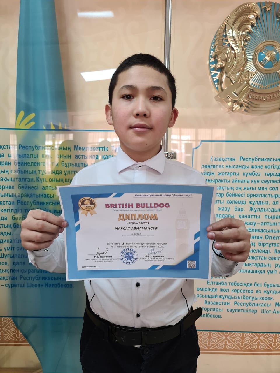 Алматы қаласы Түрксіб ауданы №84 жалпы білім беретін мектептің 6 "в" сынып оқушысы Марсат Әбілмансұр халықаралық "British Bulldog" атты ағылшын тілінен байқауда 1-орын иегері атанды. Құтты болсын! Жетекшісі - Шамгунова Жазира Анжановна. Құтты болсын!