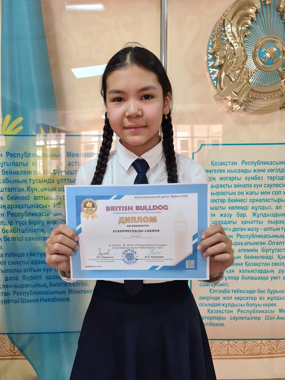 Алматы қаласы Түрксіб ауданы №84 жалпы білім беретін мектептің 6 "в" сынып оқушысы Ескермесқызы Сабина халықаралық "British Bulldog" атты ағылшын тілінен байқауда 1-орын иегері атанды. Құтты болсын! Жетекшісі - Шамгунова Жазира Анжановна. Құтты болсын!