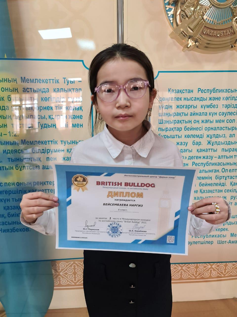 Алматы қаласы Түрксіб ауданы №84 жалпы білім беретін мектептің 6 "в" сынып оқушысы Бейсембаева Наргиз халықаралық "British Bulldog" атты ағылшын тілінен байқауда 1-орын иегері атанды. Құтты болсын! Жетекшісі - Шамгунова Жазира Анжановна. Құтты болсын! Жауапты: ДОІЖО Джакупова А.А