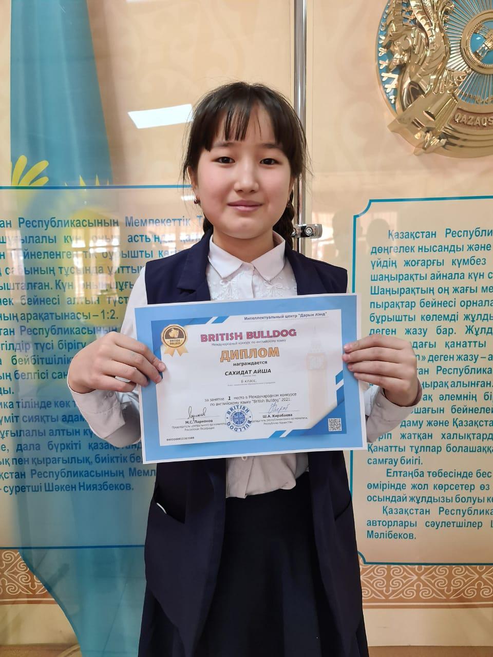 Алматы қаласы Түрксіб ауданы №84 жалпы білім беретін мектептің 6 "в" сынып оқушысы Сахидат Айша халықаралық "British Bulldog" атты ағылшын тілінен бай