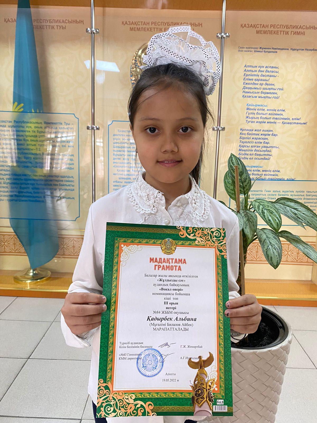 Балалар жылы аясында өткізілген "ЖҰЛДЫЗДЫ СӘТ" аудандық байқауының "вокал өнері" номинациясы бойынша кіші топта №84 ЖББМ 4 "В" сынып оқушысы Қадырбек