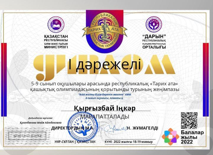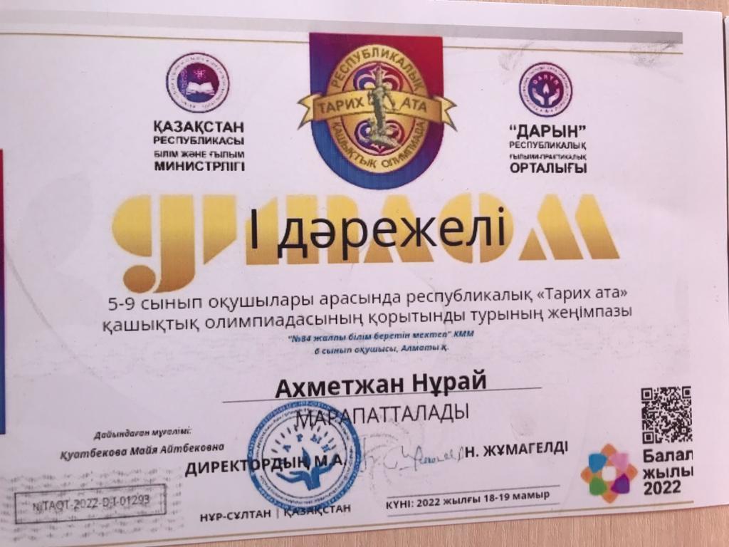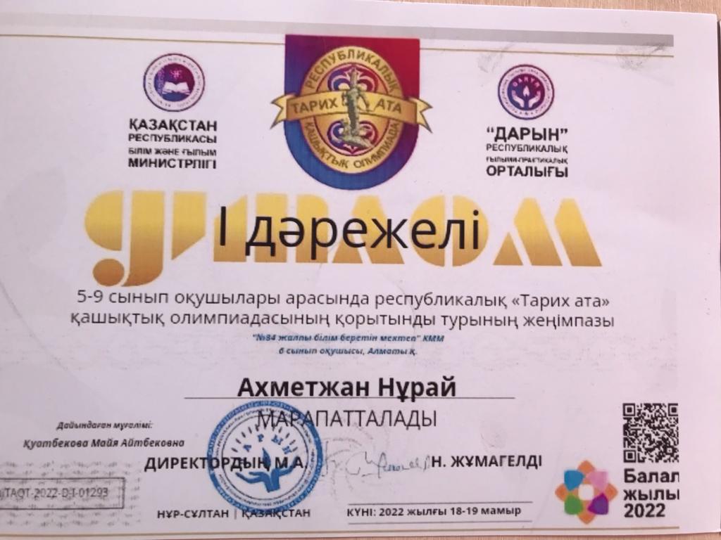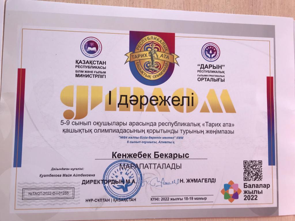 Оқушылардың Қазақстан тарихына деген қызығушылыығын арттыру, өз бетінше жұмыс жасау дағдылары мен алған білімін қолдану мақсатында Қазақстан Республикасының Білім және ғылым министрлігінің «Дарын» республикалық ғылыми-практикалық орталығының 5-9 сынып оқушылары арасындағы «Тарих ата» республикалық қашықтық олимпиадасына мектебіміздің 5-9 сынып оқушылары белсене қатысып, 1-ІІ-ІІІ дәрежелі дипломдар мен сертификаттарға ие болды. Жетекшілері: Куатбекова М.А.,Батанова Д.М.,Куралбаев Н.Б.