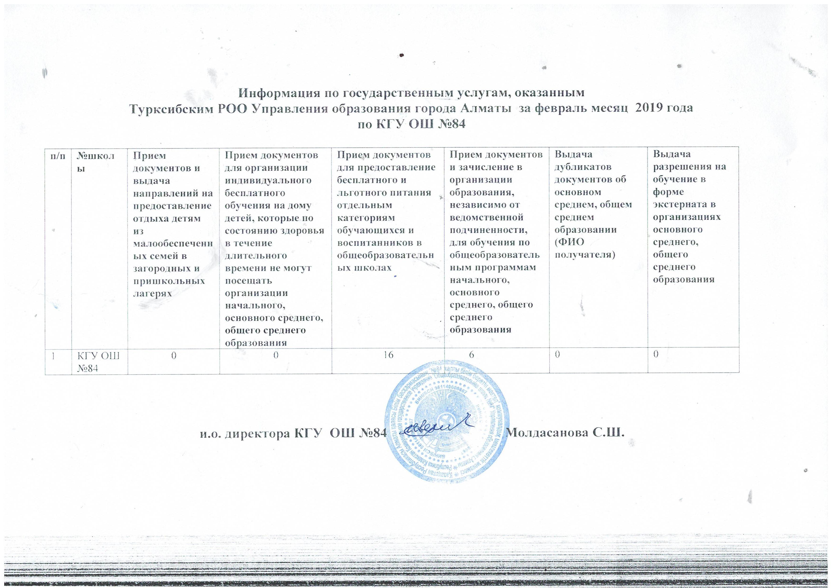04 март 2019 0 1 2 3 4 5 Информация по государственным услугам, оказанным Турксибским РОО Управления образования города Алматы за февраль месяц 2019 года по КГУ ОШ№84