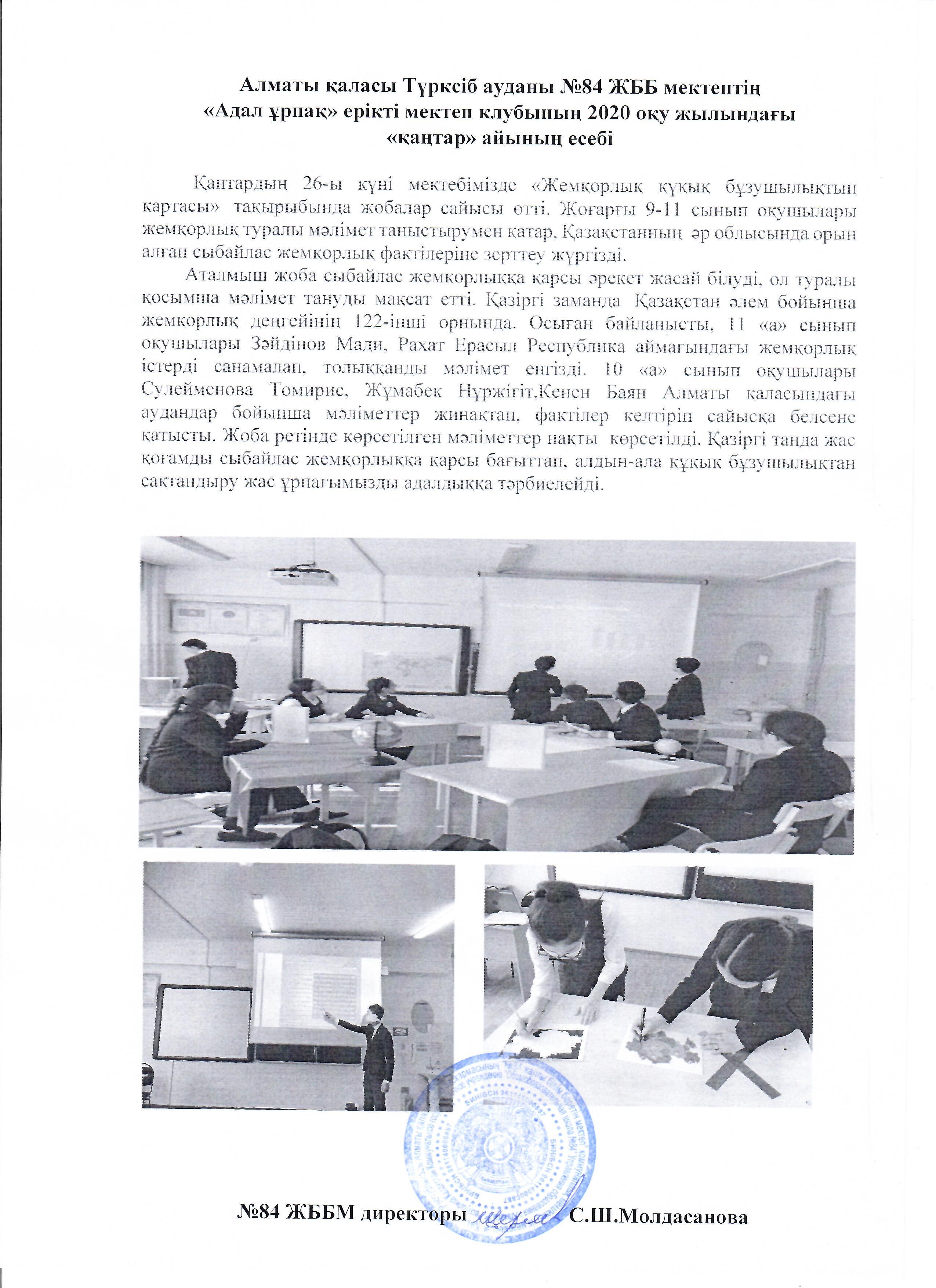 17 февраль 2022 0 1 2 3 4 5 Алматы қаласы Түрксіб ауданы №84 ЖББМ "Адал ұрпақ" ерікті клубының қаңтар айының ЕСЕБІ Алматы қаласы Түрксіб ауданы №84 ЖББМ "Адал ұрпақ" ерікті клубының қаңтар айының ЕСЕБІ