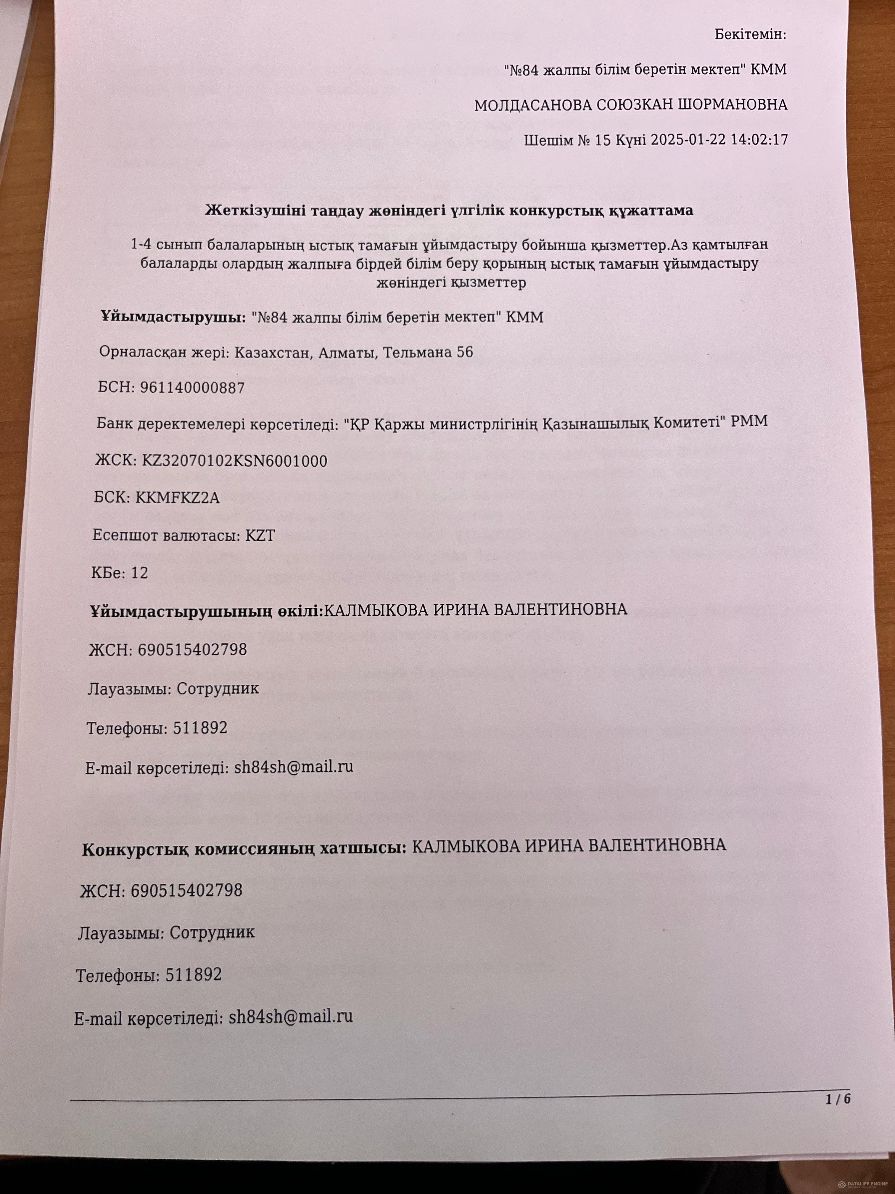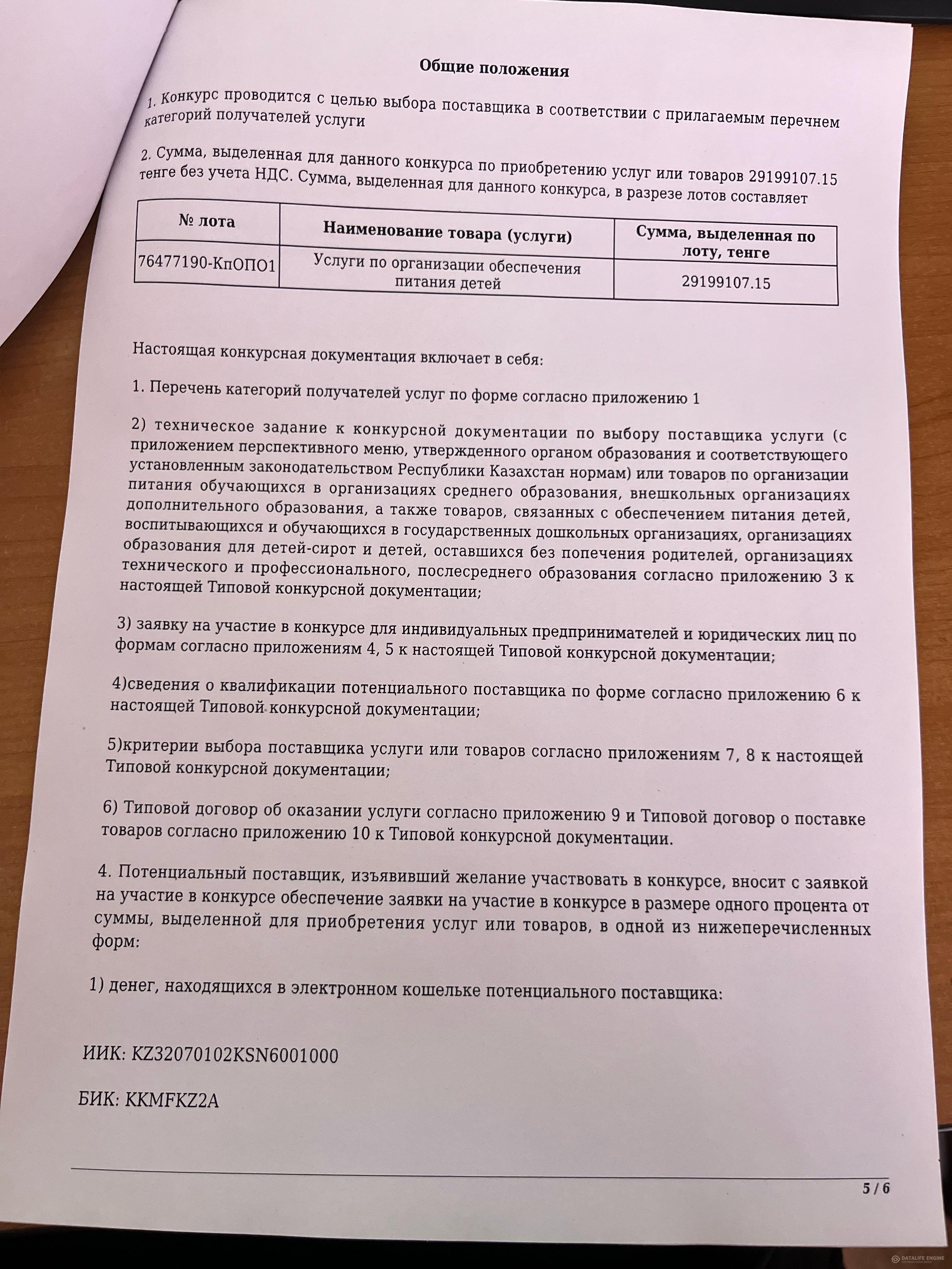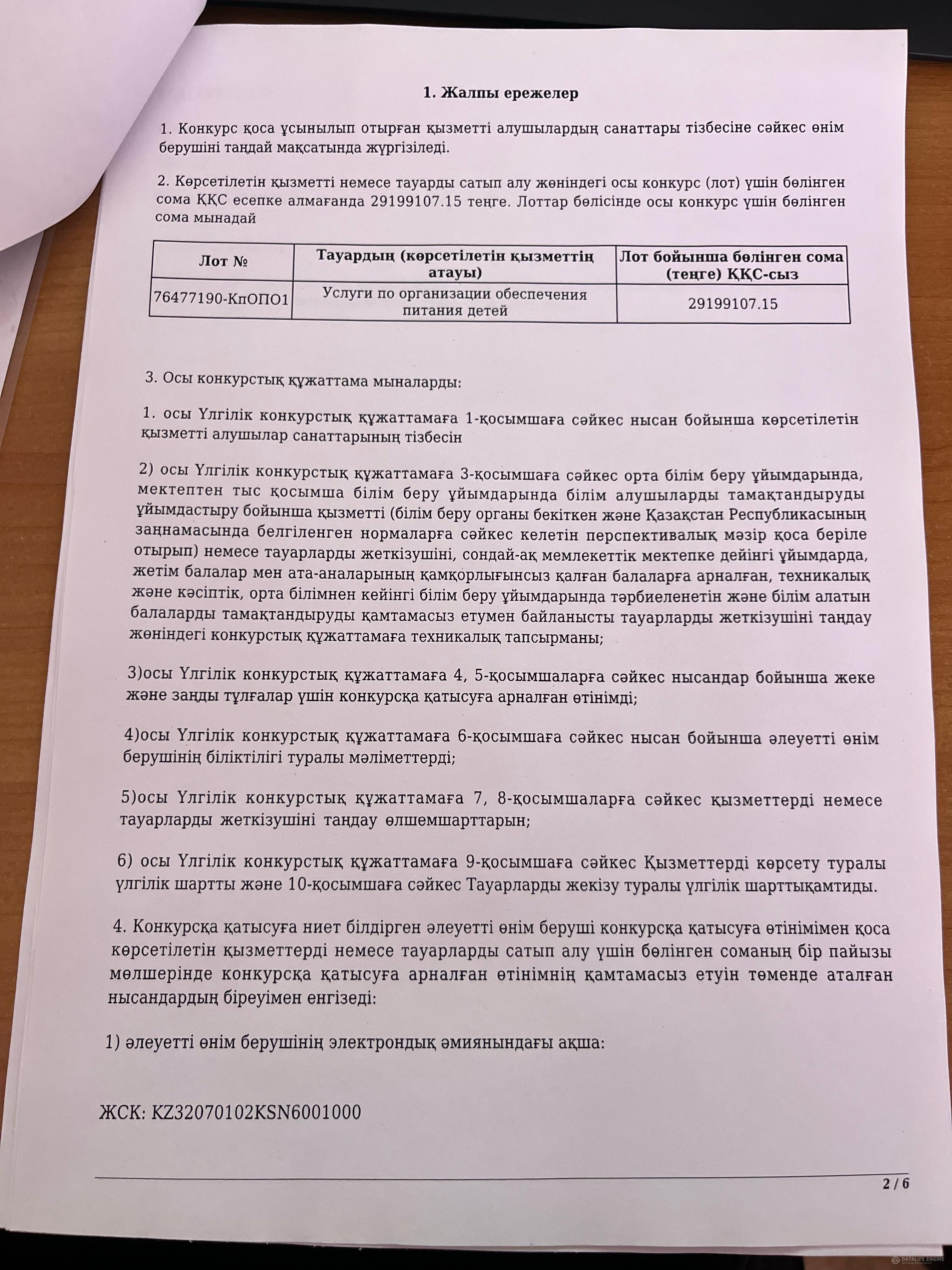 Конкурсная документация по выбору поставщика услуги питания КГУ ОШ №84