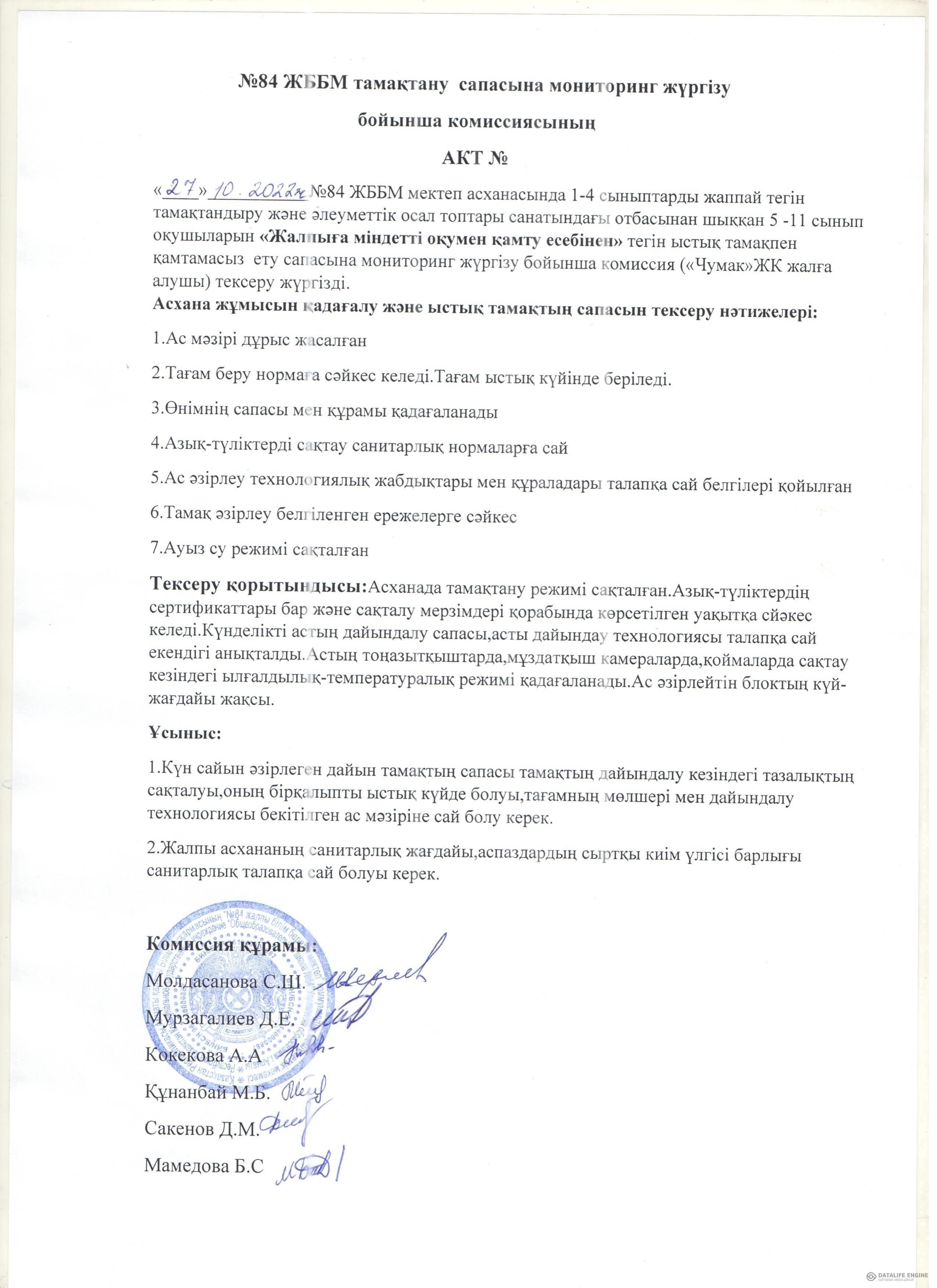 28 октябрь 2022 40 1 2 3 4 5 Асхана жұмысын қадағалау және ыстық тамақтың сапасын тексеру АКТСІ Асхана жұмысын қадағалау және ыстық тамақтың сапасын тексеру АКТСІ