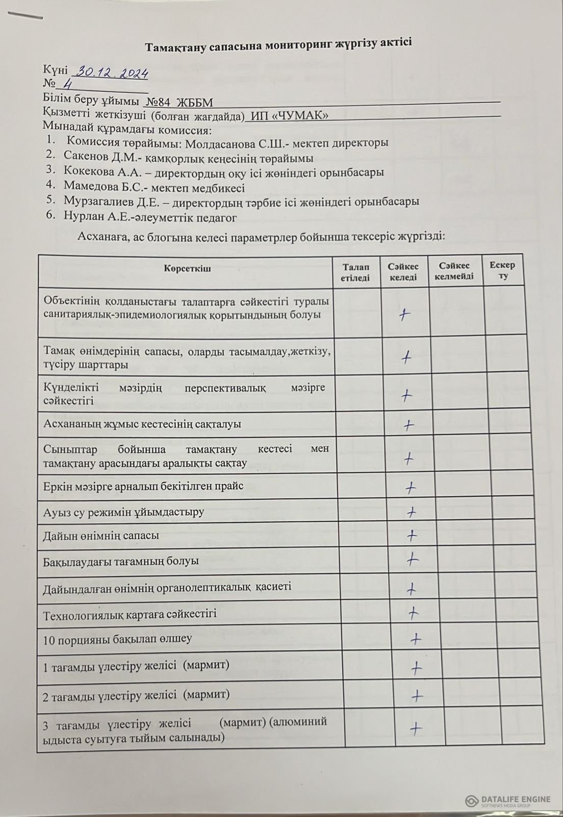 Тамақтану сапасына мониторинг жүргізу актісі 30.12.2024 жыл