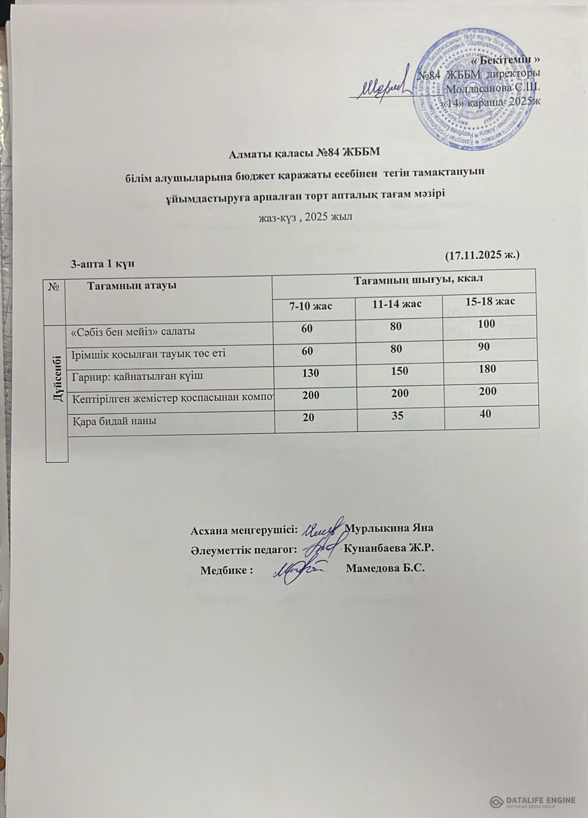 Ас мәзірі 17.11.2025ж.Меню 17.11.2025 г.